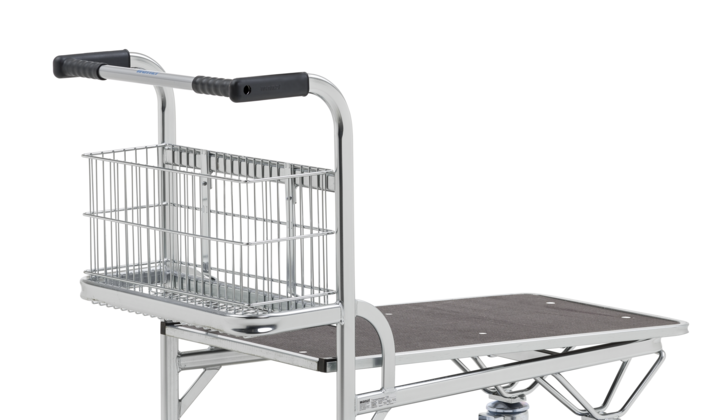Châssis en tube ovale plat. Poignée à embouts tubulaires en plastique. Plateau fil avec dispositif antiglissement grâce au fil d’entourage. Éléments en plastique sur le cadre et le plateau réduisant le bruit. Panier protégé par un cadre en tube ovale plat.