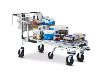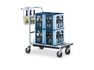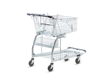 La série T de Wanzl regroupe les chariots de manutention pour les boissons, la vente en libre-service de gros ou les magasins de bricolage. Il s’agit donc, de manière générale, de magasins dans lesquels les clients achètent des marchandises totalement différentes de poids très variables. Le T26B est un chariot de manutention classique qui a fait ses preuves. Il dispose d’une grande plateforme de chargement en bois et d’un panier grillagé doté de poignées ergonomiques. Par conséquent, les clients peuvent transporter les petites pièces séparément des grandes caisses de boissons, des sacs de terreau ou autres. En fonction de l’offre du commerçant, le T26B se décline aussi dans une version plus petite ou une version sans panier grillagé. Lors de la conception de ses chariots de manutention, Wanzl répond à tous les besoins de ses clients provenant de secteurs d’activité totalement différents.