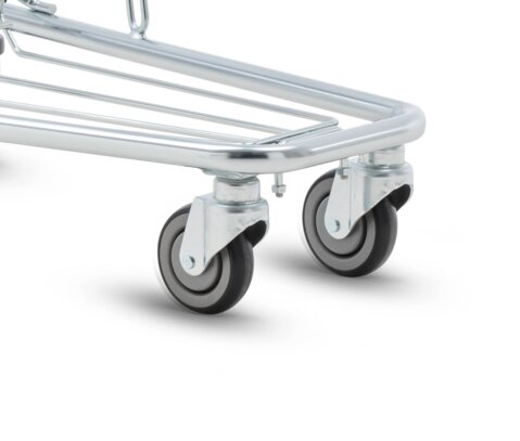 roues d’origine Wanzl, résistantes à l’abrasion, sans entretien, avec bagues déflectrices en plastique. Fixation de la roue dissimulée pour éviter les vols.