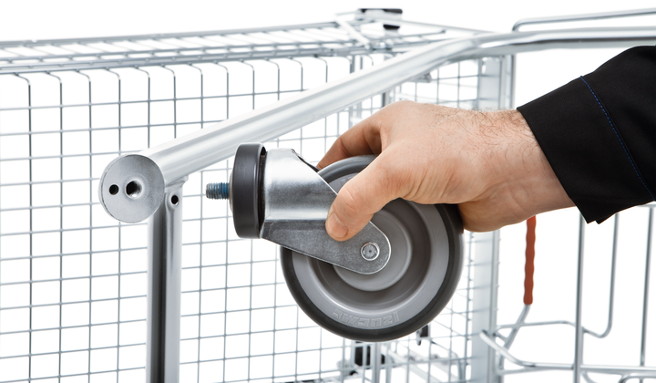 Les roues d’origine Wanzl sont vissées au châssis par le dessous, avec des vis dissimulées et des outils spéciaux.