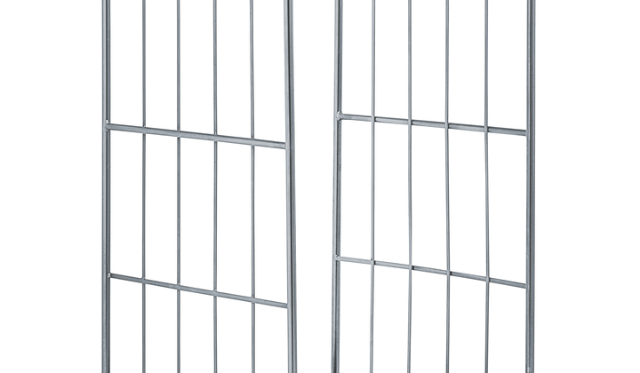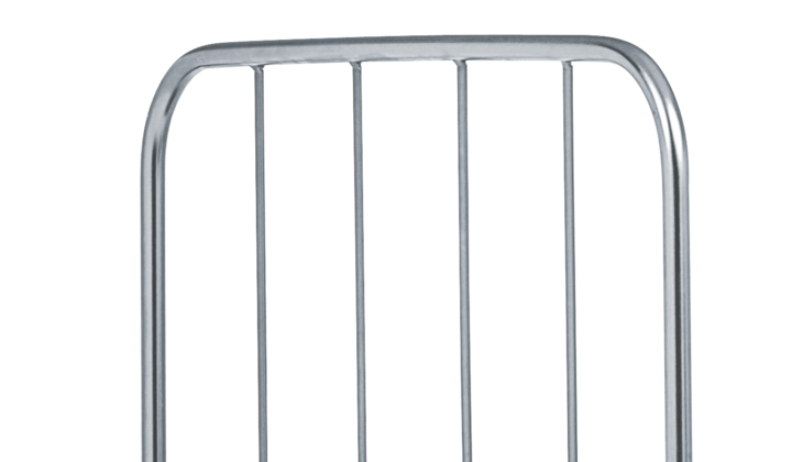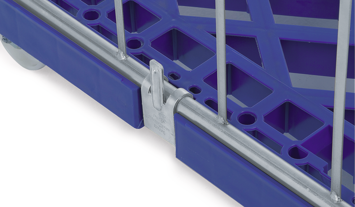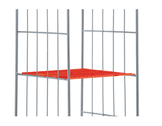 Châssis en plastique avec de larges traverses d’appui. Parois latérales avec cadre en tube rond et grille en acier plat, crochets de fixation intégrés.