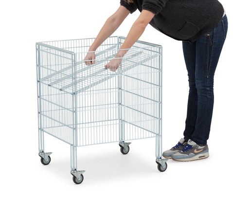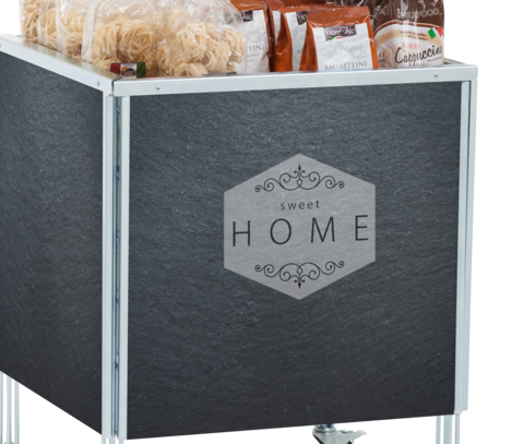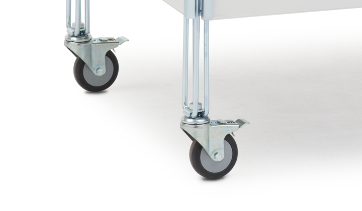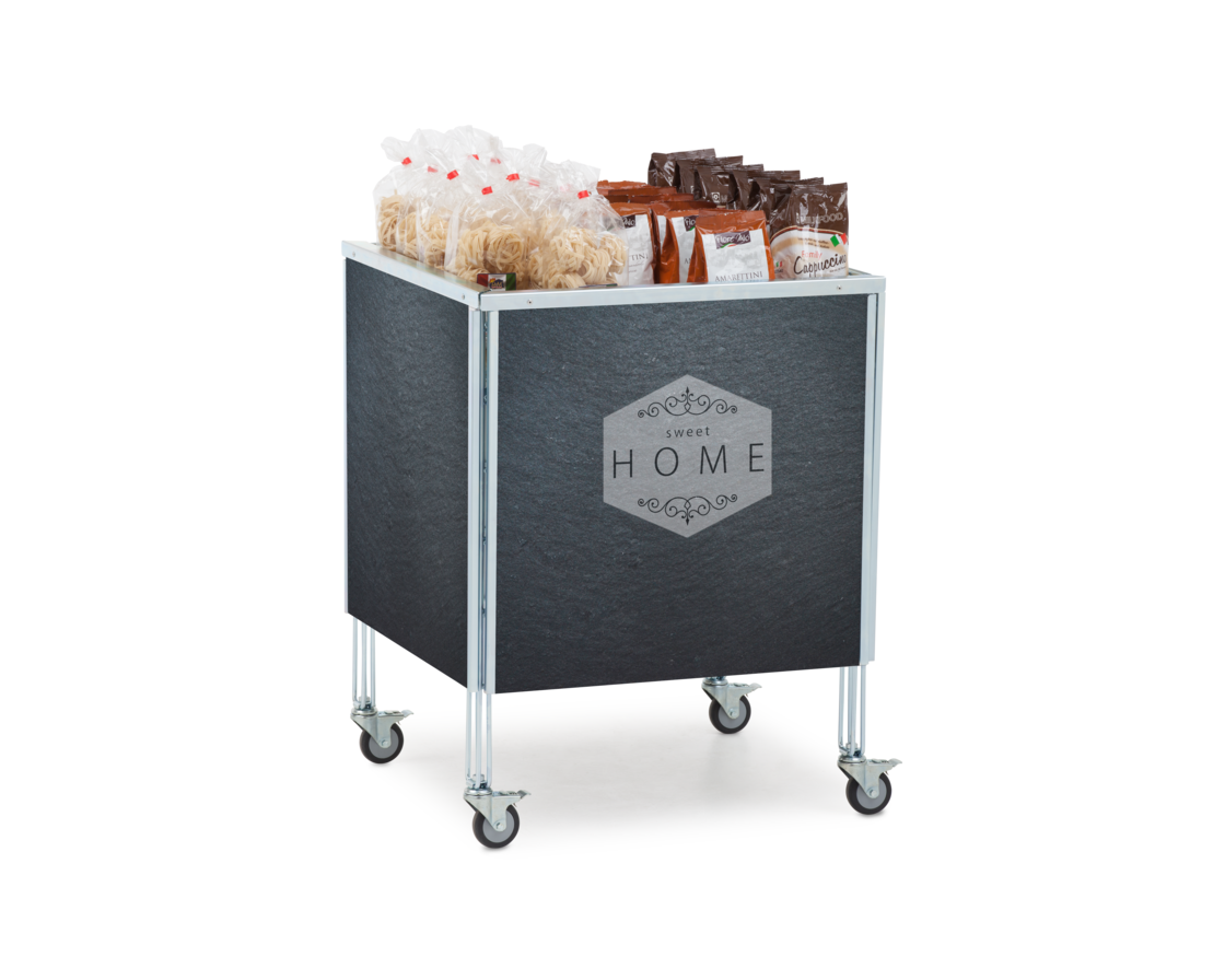 Table de vente pratique pour marchandises en promotion. Grâce à ses roues et à ses freins, elle est facile à monter et à démonter, par exemple si elle est utilisée devant le supermarché.
