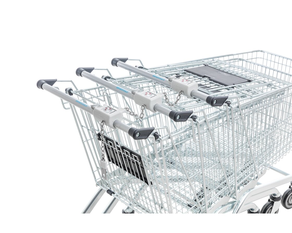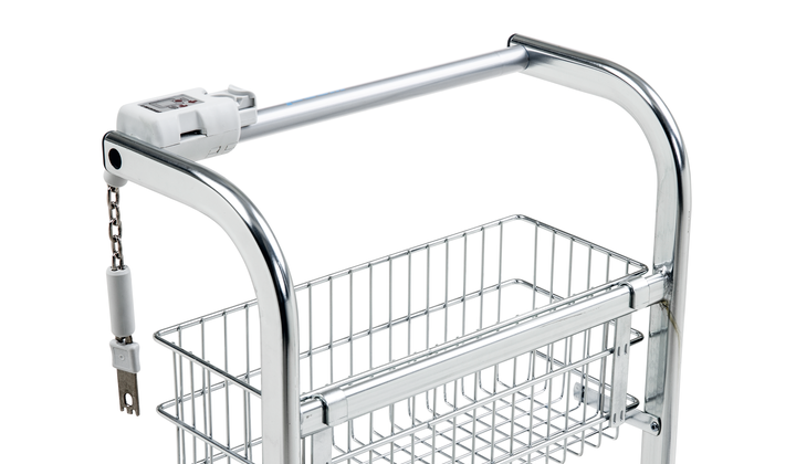Le système de consignation Wanzl universel avec son dispositif éprouvé de tiroir d’insertion de pièces pour une utilisation universelle adapté à de nombreux modèles de chariots de manutention. Position variable sur la poignée.