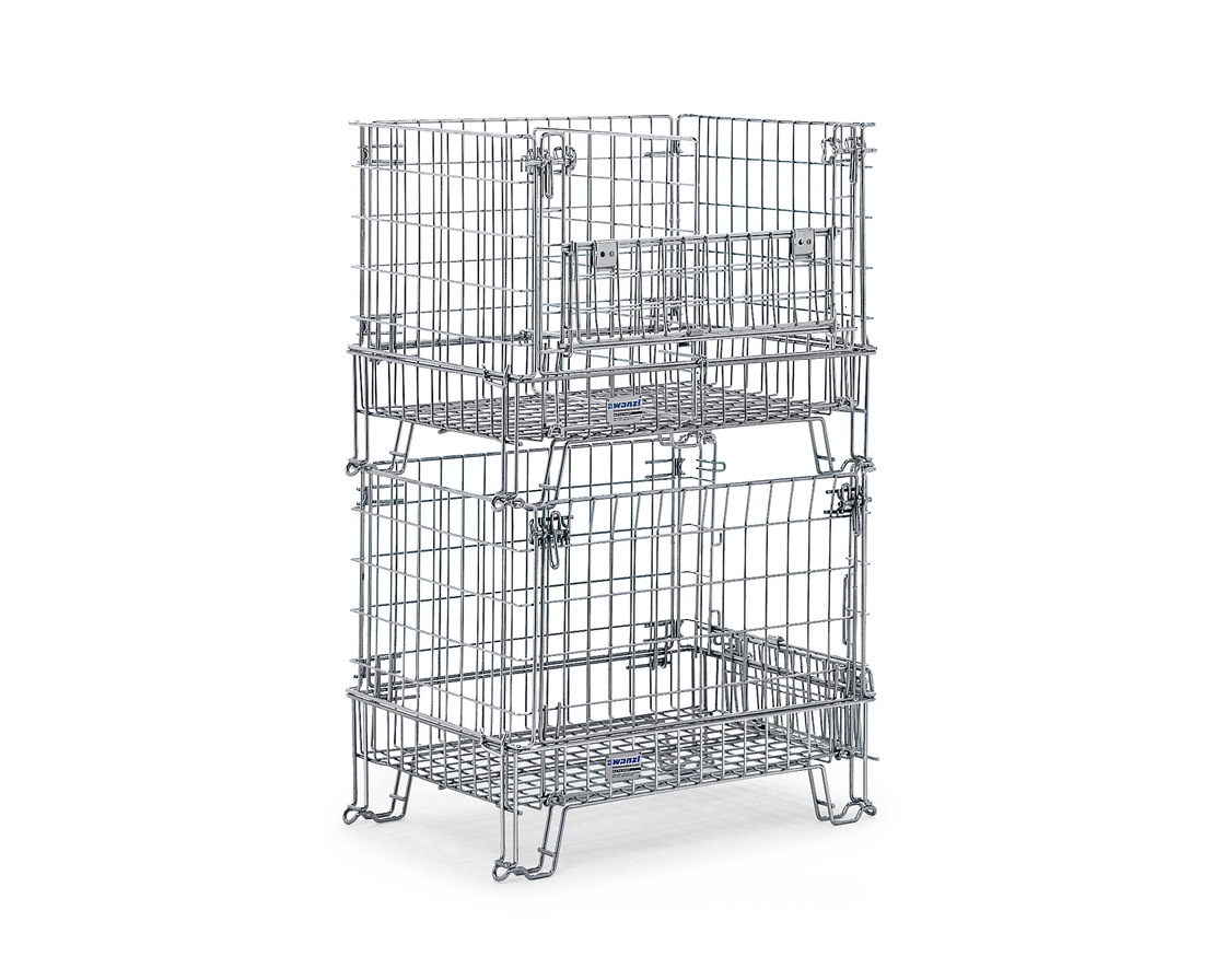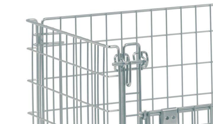 Construction robuste en fil avec pieds de superposition en fil. Avec 1 grille de fermeture rabattable sur la longueur ou la largeur.