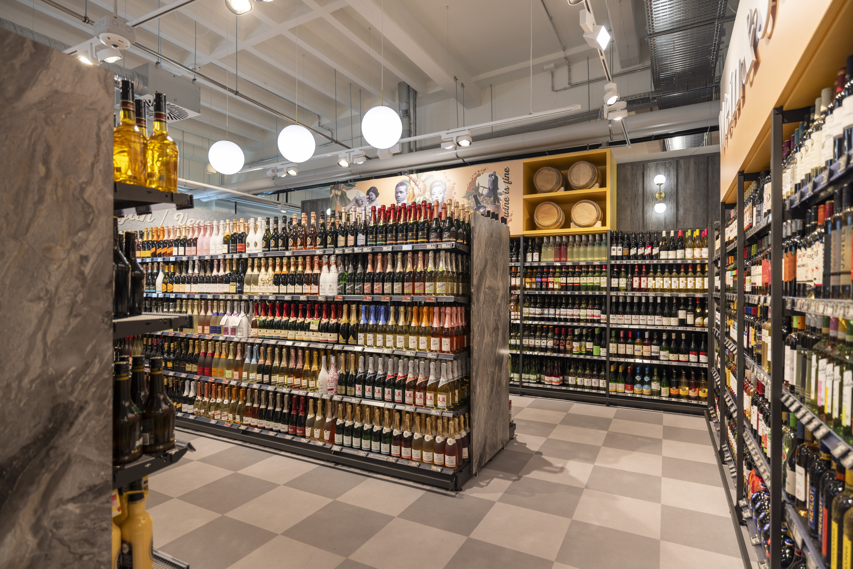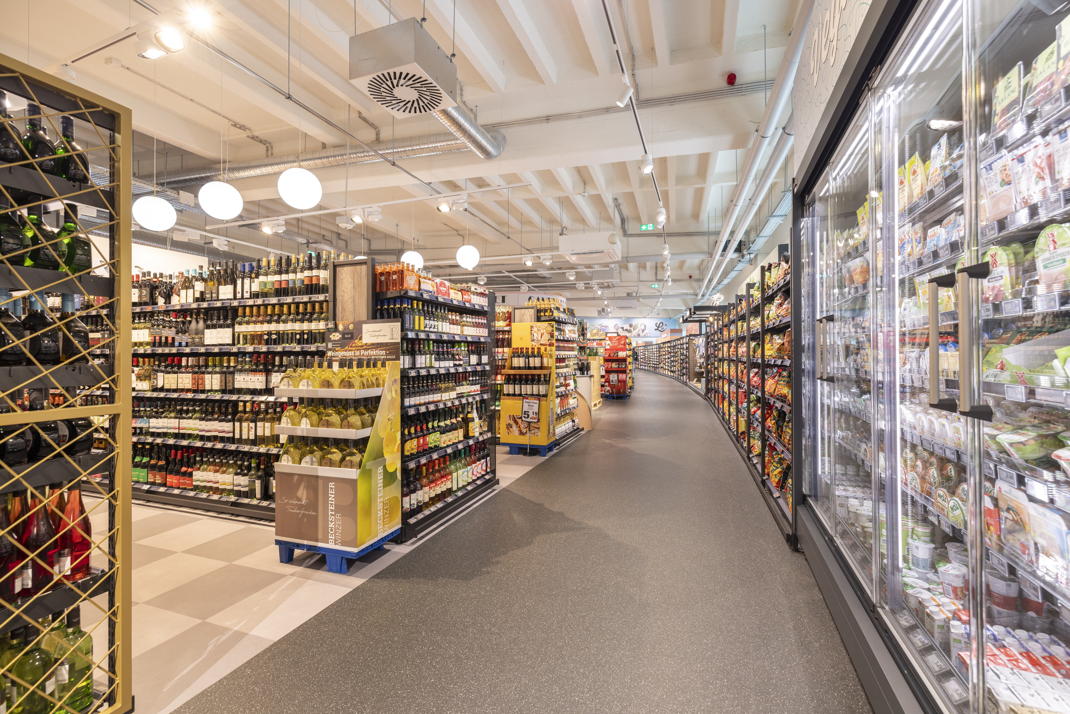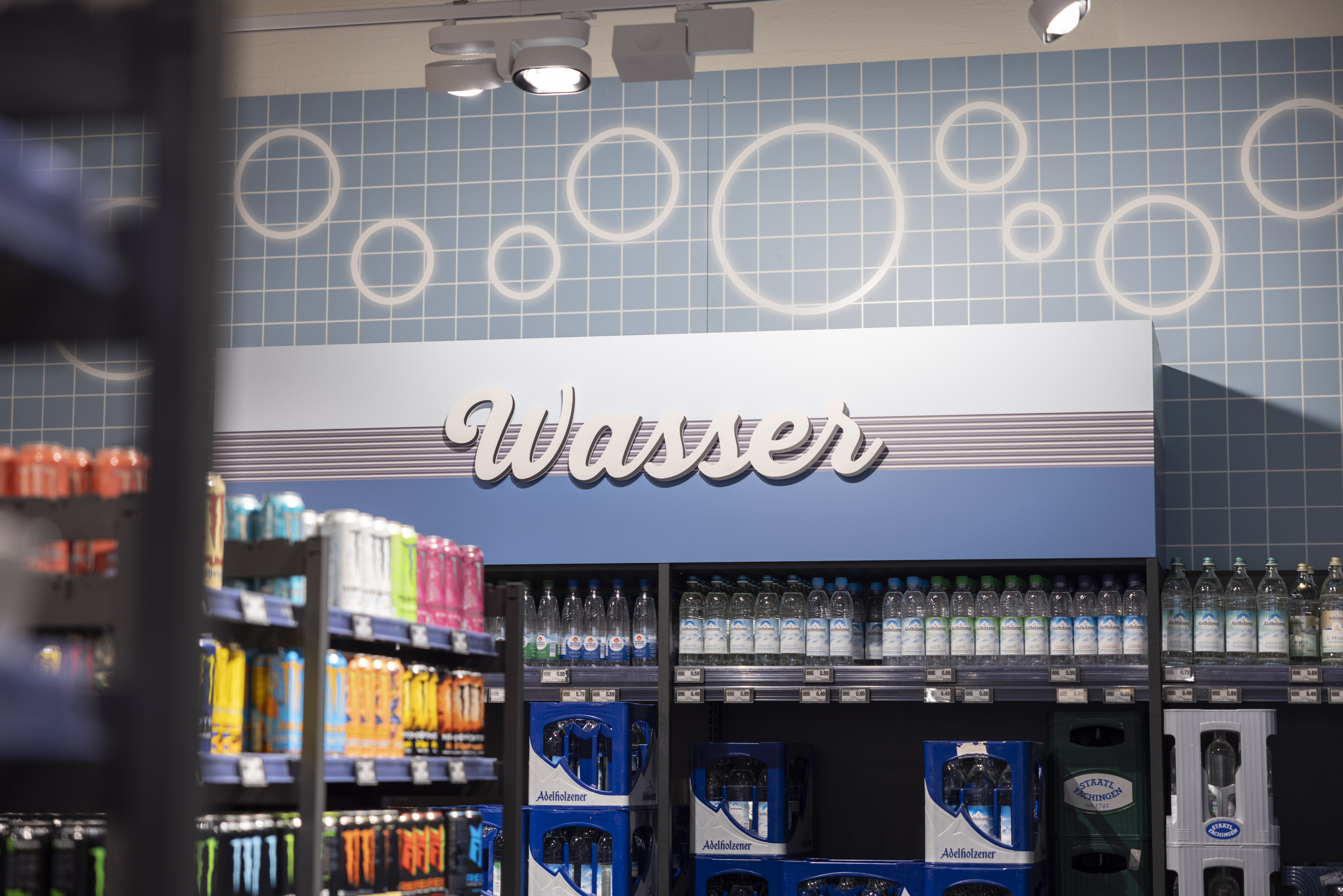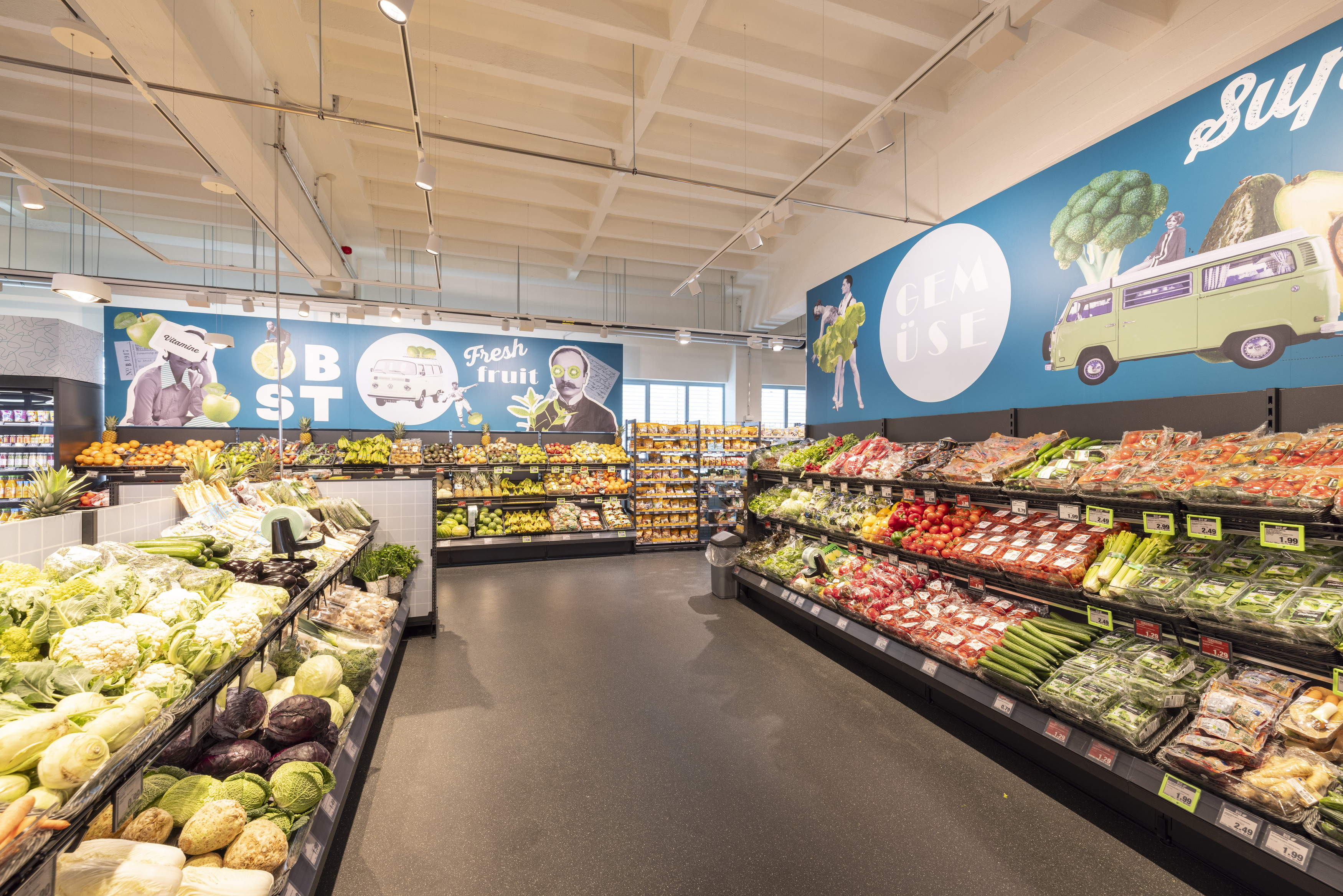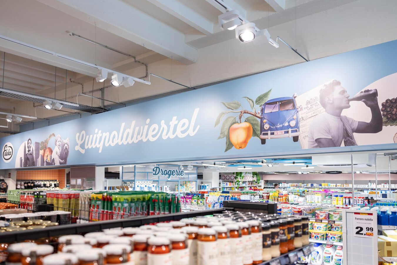 « J’aime parcourir tout le magasin. Au fur et à mesure que les clients passent les différents rayons, ils veulent être surpris. En effet, nous ne nous contentons pas de proposer aux clients des rayons dans lesquels ils se servent puis repartent, mais nous aménageons toujours des points fixes qui les incitent à s’arrêter et suscitent leur enthousiasme », décrit Christoph Schmitt le concept du magasin. Les clients de l’EDEKA Luitpoldviertel passent d’abord par le rayon fruits et légumes décoré dans des tons bleu frais et vert citron avec des parois et des caisses en bois qui rappellent un magasin de ferme et renforcent l’impression de fraîcheur des produits. Ici et dans tous les rayons suivants, on trouve des graphismes originaux qui combinent habilement des images en noir et blanc des années 50 avec des illustrations d’aliments et de véhicules de collection. Par exemple, la jupe d’une danseuse est composée d’une feuille de laitue éclatante, un gros brocoli pousse du toit d’un bus Volkswagen ou les yeux d’un homme élégant avec une moustache sont créés avec deux rondelles de kiwi. Dans le rayon des boissons aux couleurs inspirées d’un stand à limonades, des citations pleines d’autodérision font sourire tandis que les carreaux bleu clair avec des cercles blancs qui ressemblent à des bulles d’air évoquent des journées joyeuses au bord d’une piscine en plein air. Le rayon des vins et spiritueux, qui reflète l’ambiance d’une ancienne cave à vin avec ses lambris en bois foncé, ses fûts de vin, ses plafonniers et ses lampes murales à l’aspect antique ainsi que son sol à motif d’échiquier, crée un contraste raffiné et incite les clients à déguster l’une des très bonnes bouteilles proposées.