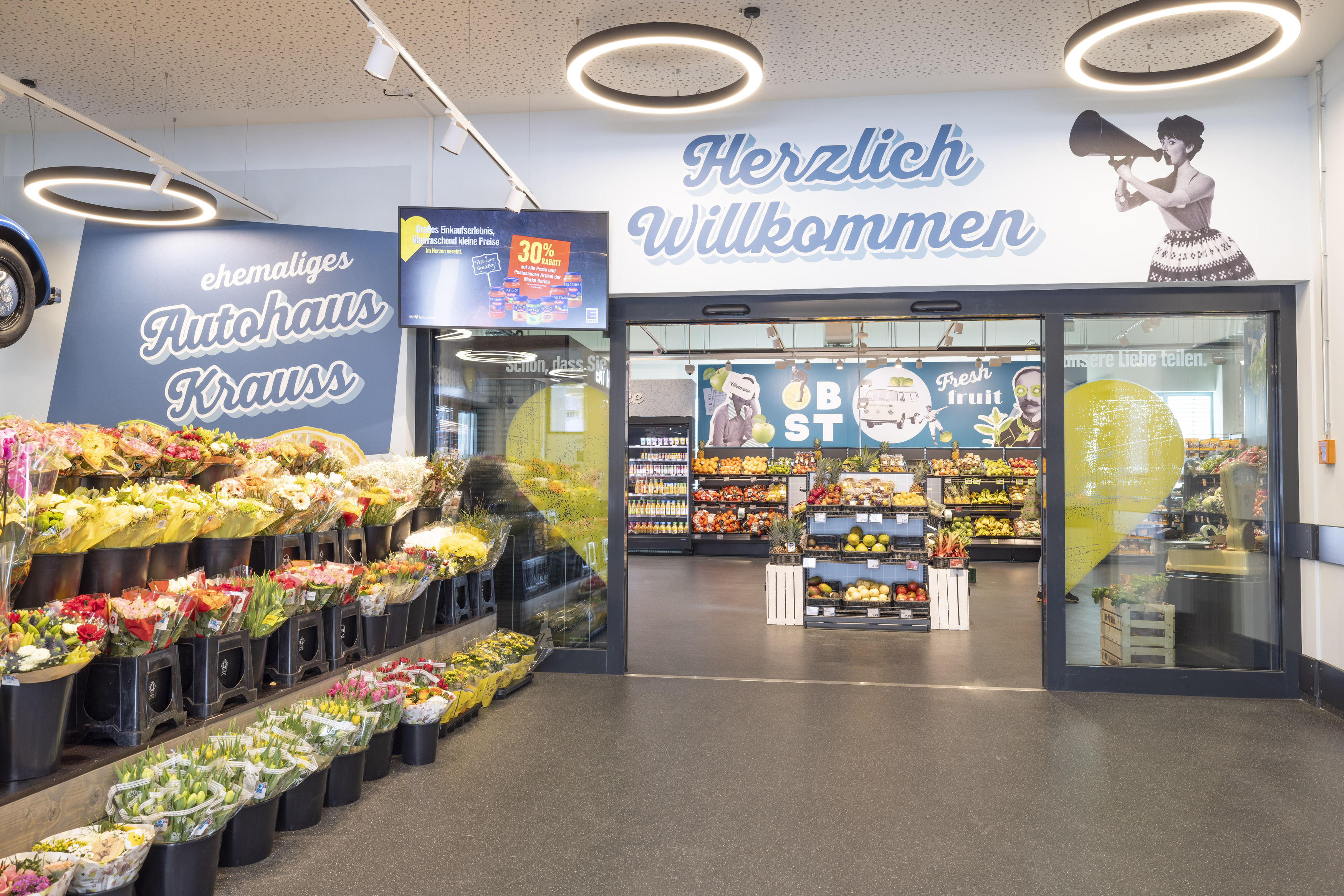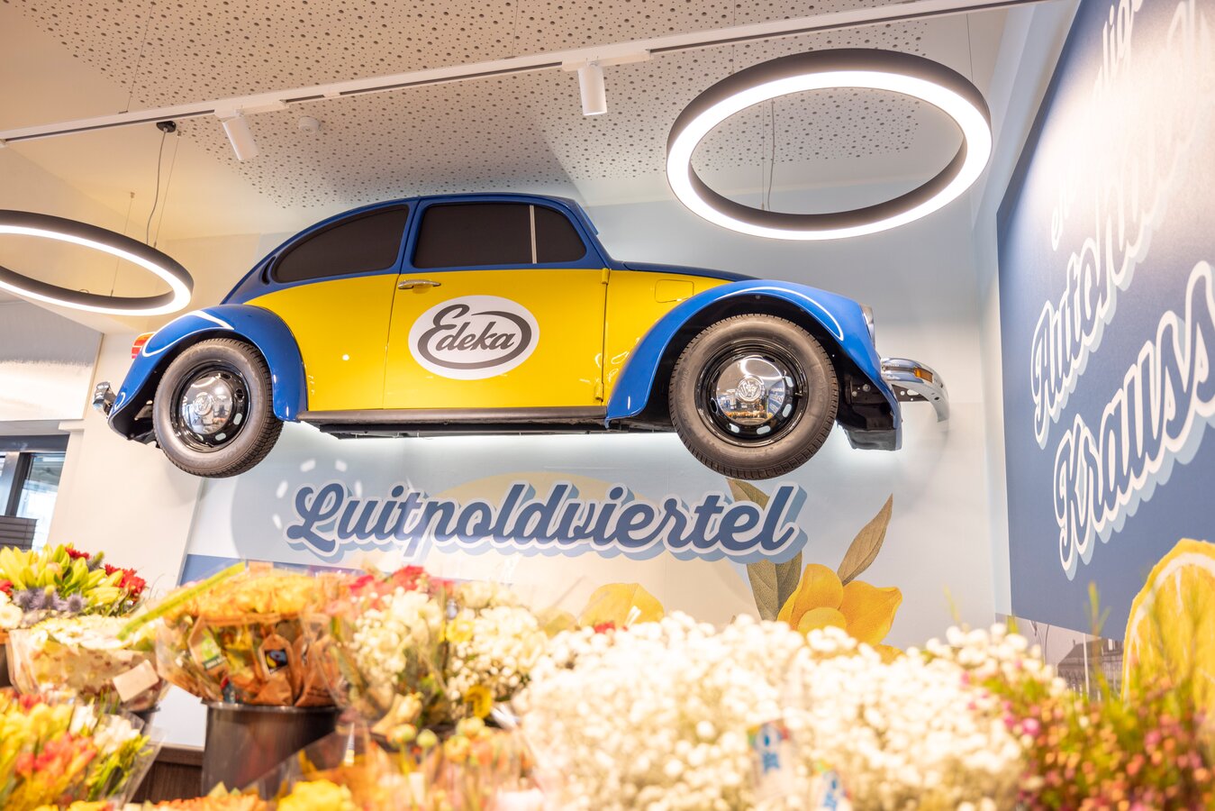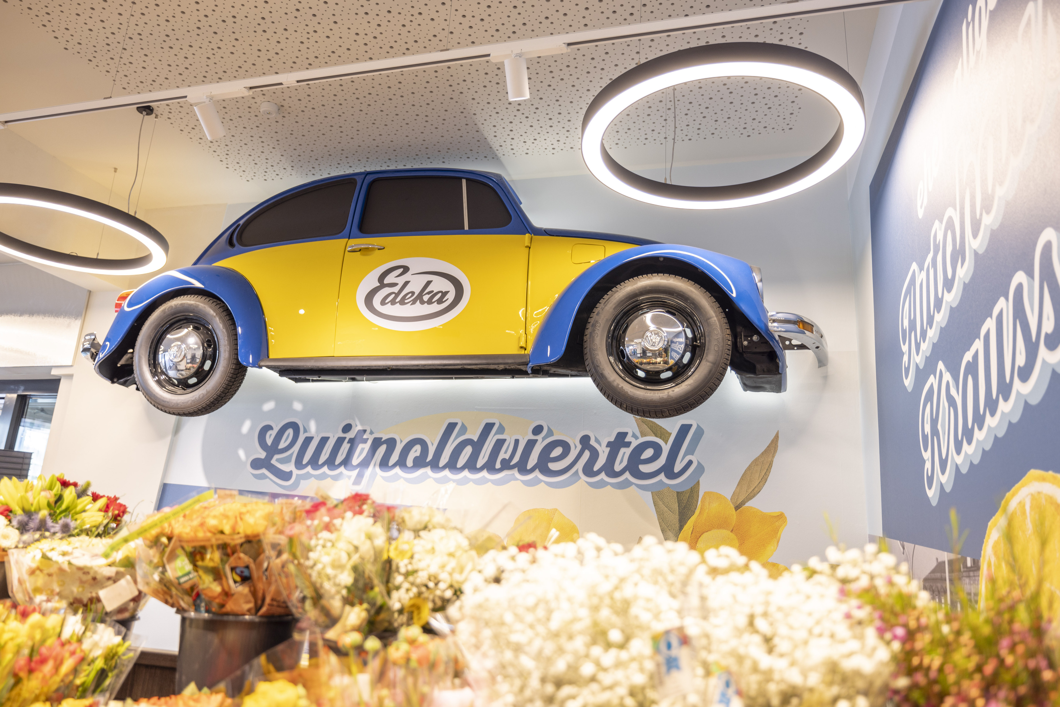 Dès qu’ils pénètrent dans le magasin, les clients du nouvel EDEKA du quartier de Luitpold – surnommé « Lui » – sont accueillis par une mer de fleurs et plongés dans l’époque des années 50 aux tons pastel. À côté de l’entrée, l’inscription « Ancienne concession Krauss » ainsi qu’une coccinelle Volkswagen coupée en deux aux couleurs typiques d’EDEKA jaune et bleu accrochée au mur font référence au passé exaltant du bâtiment. Outre le système de collecte des consignes conçu comme un bus Volkswagen, les clients peuvent aussi voir un tableau d’affichage avec des photos et des informations historiques sur la concession. Des murs bleu clair, des panneaux d’information de style rétro et des plafonniers ronds imitant l’allure d’enjoliveurs de roue chromés brillants d’anciens véhicules Volkswagen viennent parfaire l’aménagement harmonieux. « L’ancienne concession Krauss est un endroit très spécial pour nous et pour la région. Notre objectif était d’intégrer l’histoire du bâtiment dans le design du magasin EDEKA et, selon la devise « EDEKA meets VW », d’associer son histoire initiale en tant que concession automobile au magasin EDEKA moderne », se souvient Christoph Schmitt, qui gère le nouveau magasin EDEKA avec son partenaire Wolfgang Louzil. Ils souhaitaient un concept global et homogène pour leur magasin : « Nous tenions absolument à bénéficier d’un aménagement optimal qui tient compte des normes applicables aux monuments historiques. C’est pourquoi nous souhaitions un fournisseur complet offrant toutes les prestations, de la planification et du design du magasin à la production de l’équipement intérieur et à son montage. Et dans tous ces domaines, la société Wanzl était notre premier choix. »