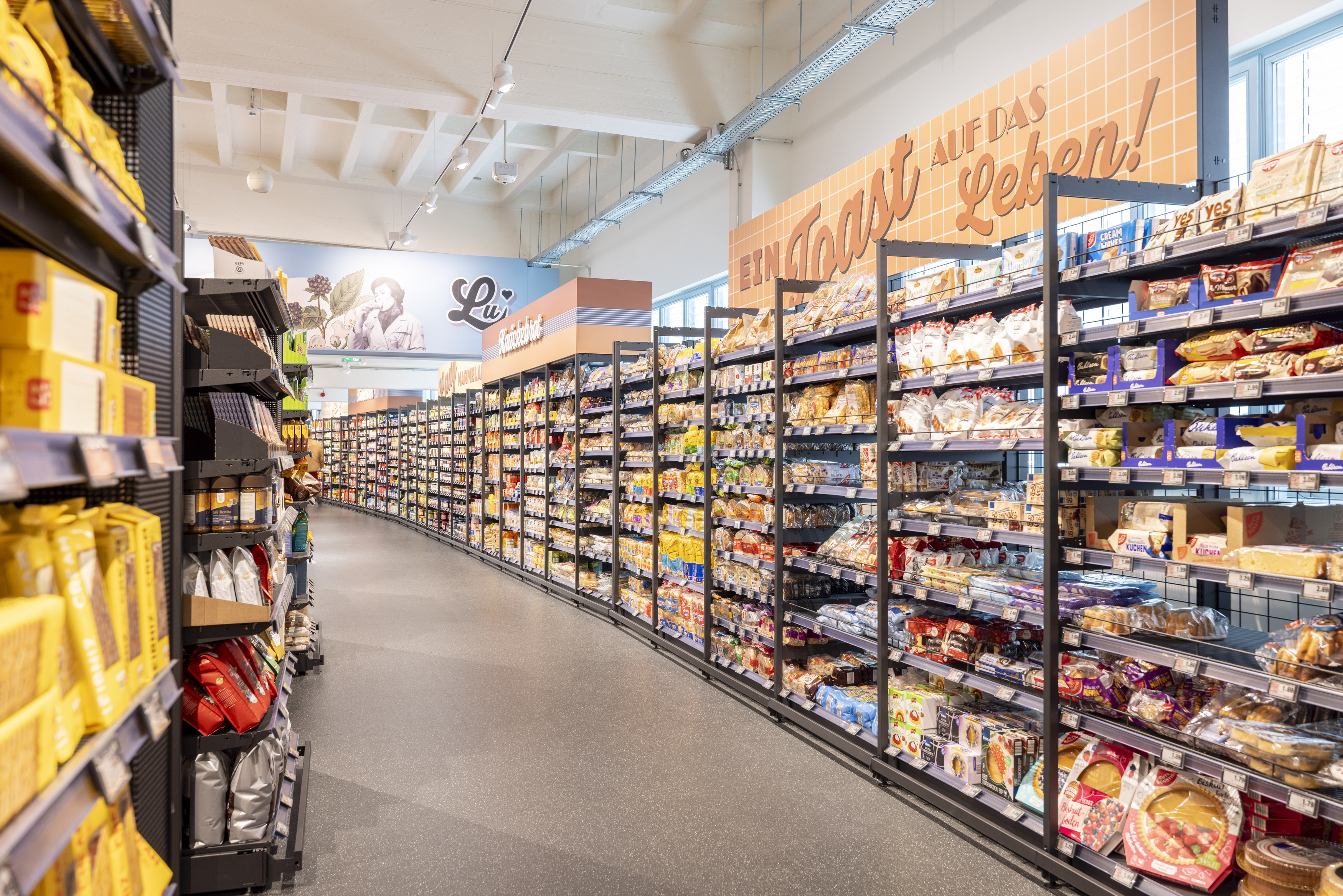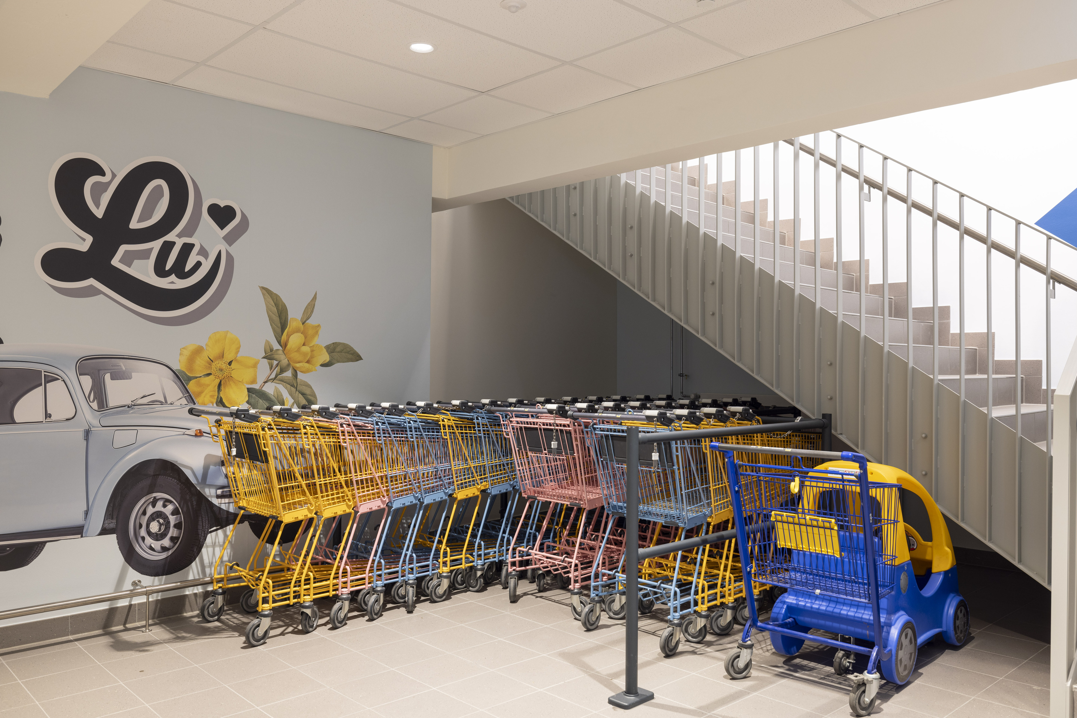Dans le tout nouveau quartier de Luitpold à Nuremberg, l’expert du commerce de détail Wanzl a conçu un supermarché exceptionnel dans le style des années 50 pour le groupe EDEKA Schmitt & Louzil, qui gère déjà avec succès des magasins à Schwaig près de Nuremberg ainsi qu’à Lauf an der Pegnitz. La particularité de ce magasin EDEKA ? C’est le classement aux monuments historiques du bâtiment de l’ancienne concession Krauss. Construit en 1954, le bâtiment a abrité pendant de nombreuses années l’un des plus grands concessionnaires Volkswagen de Moyenne-Franconie. Cette histoire fascinante du bâtiment a été prise en compte jusque dans les moindres détails par l’équipe Creative Design de Wanzl lors de la conception du magasin phare du groupe s’étendant sur une surface de 1 580 m2 pour offrir aux clients l’atmosphère authentique des années 50 et ainsi rendre hommage au concessionnaire Volkswagen ayant initialement occupé les lieux. Des chariots libre-service aux couleurs pastel et aux graphismes rétro ludiques sur les murs en passant par l’éclairage au plafond façon enjoliveur de roue chromé : l’expérience d’achat est à la fois divertissante et unique en Allemagne.