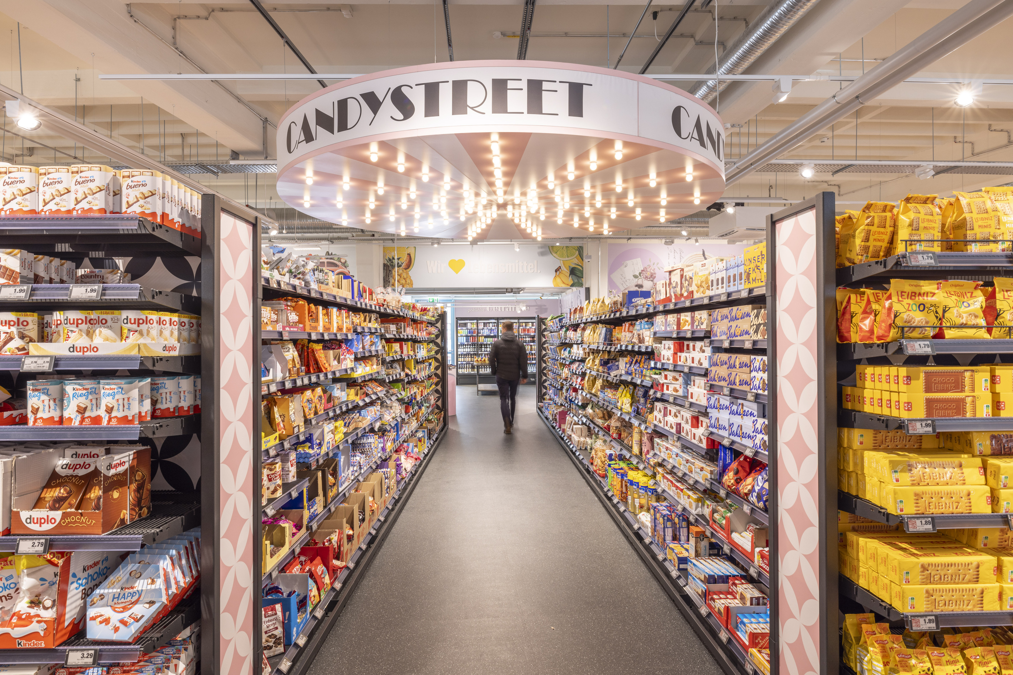 « Pour nous, il était crucial de collaborer étroitement avec Wanzl pour que nos idées soient comprises et mises en œuvre », explique Christoph Schmitt. « Nous n’avons cessé de communiquer, nous avons discuté de certains graphismes et les avons modifiés, nous avons choisi des échantillons et des décors et nous avons également trouvé l’éclairage optimal pour chaque rayon avec Wanzl. Ce fut une formidable collaboration ! » Un plafonnier original attend les clients de l’EDEKA Luitpoldviertel dans le rayon confiserie. Au-dessus de la « Candystreet » rose se trouve un énorme cercle aux rayures semblables à celles d’une sucette et doté de nombreuses petites ampoules. Quelques pas plus loin, on arrive au rayon des articles de droguerie. Des miroirs incurvés et des lampes rondes sont suspendus au plafond. Comme dans la zone d’entrée du magasin, ils représentent les légendaires enjoliveurs de roue chromés des coccinelles Volkswagen. Tino Pilharcz explique l’approche conceptuelle de Wanzl : « Notre objectif était de créer un magasin unique qui reflète à la fois l’histoire du bâtiment et l’expérience personnelle des clients. Nous voulions faire découvrir l’histoire du bâtiment aux visiteurs et leur donner l’impression de vivre les années 50 grâce à notre storytelling et à notre aménagement coloré. »