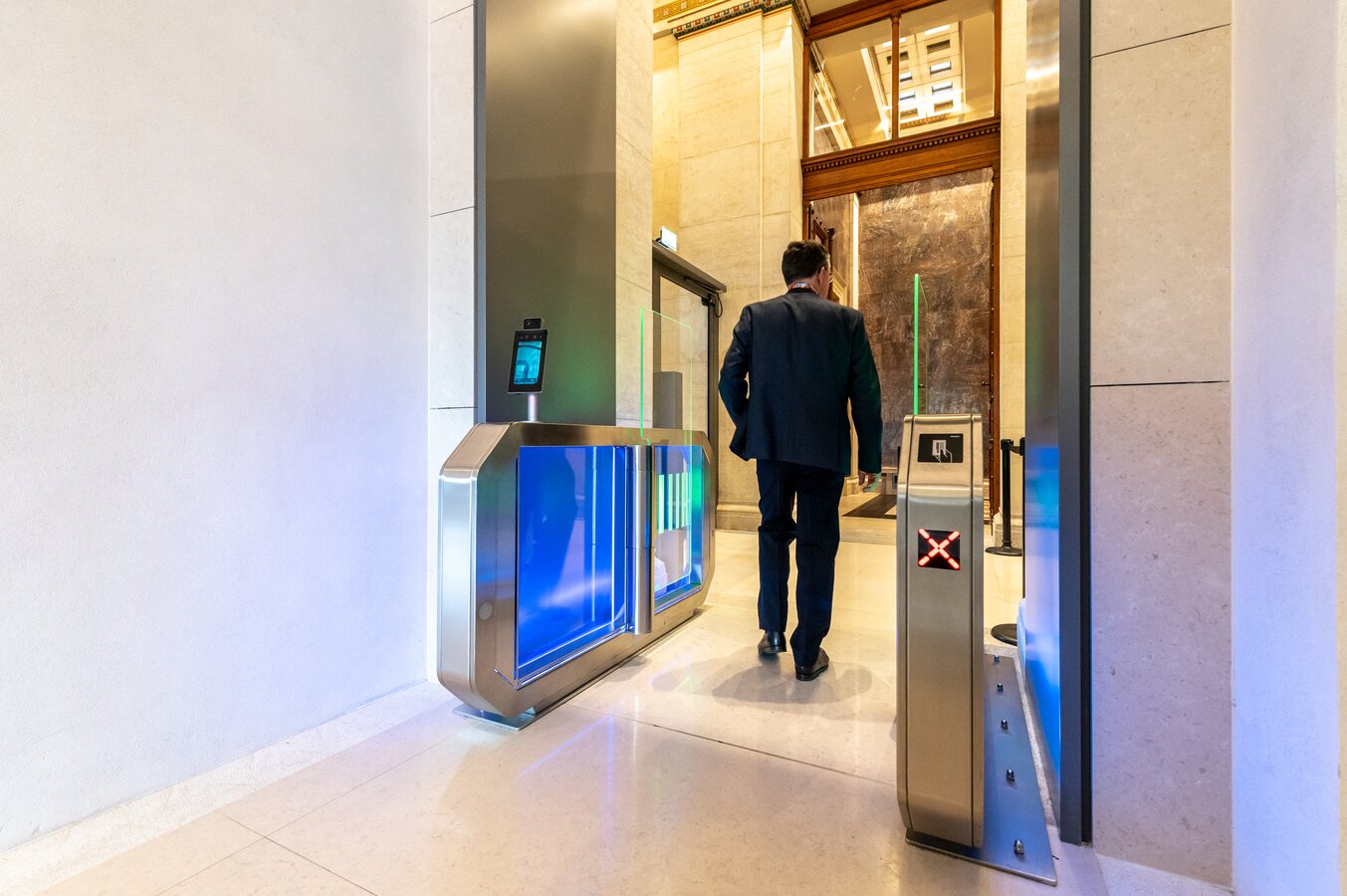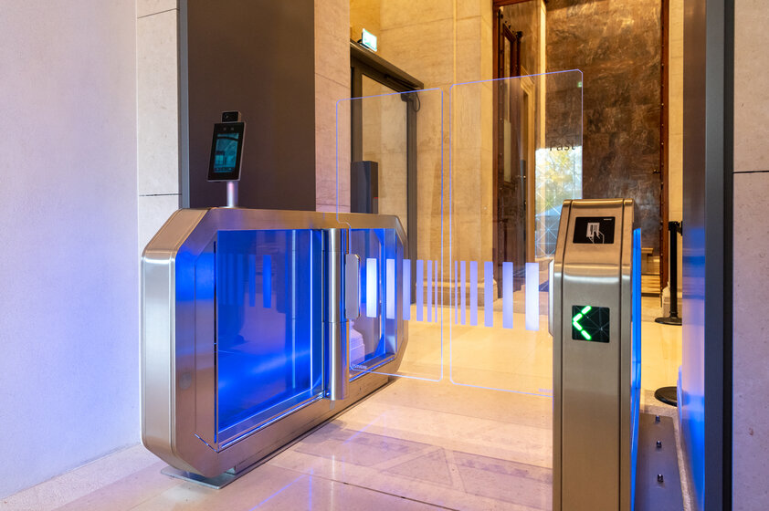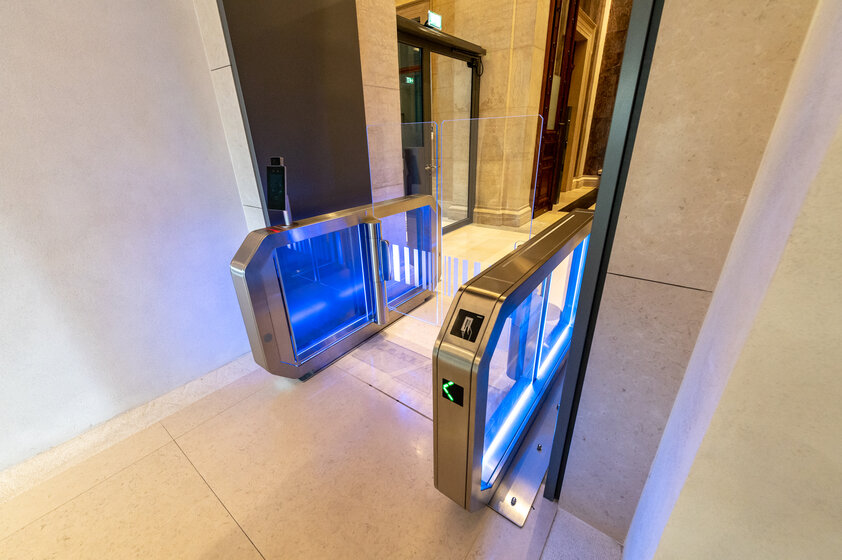 Outre la modernisation complète, une attention particulière a été accordée à la préservation de la substance architecturale du bâtiment du Parlement lors de la remise en état de ce monument historique. En raison de la nature du sol, le portillon d’accès de Wanzl a donc été fixé au sol sur des plaques de montage spécialement fabriquées à cet effet. Avec son boîtier modulaire intemporel et élégant en acier inoxydable et ses éléments de verrouillage en verre trempé, le Galaxy Gate 1.1 se fond avec discrétion dans la zone d’accueil. Les systèmes d’accès assurent également une visualisation facile des droits d’accès grâce à des éléments en verre éclairés par des LED. Le Galaxy Gate 1.1 entièrement automatique et facile à utiliser de Wanzl renforce l’aspect sécurité et esthétique de l’accès au bâtiment du Parlement.