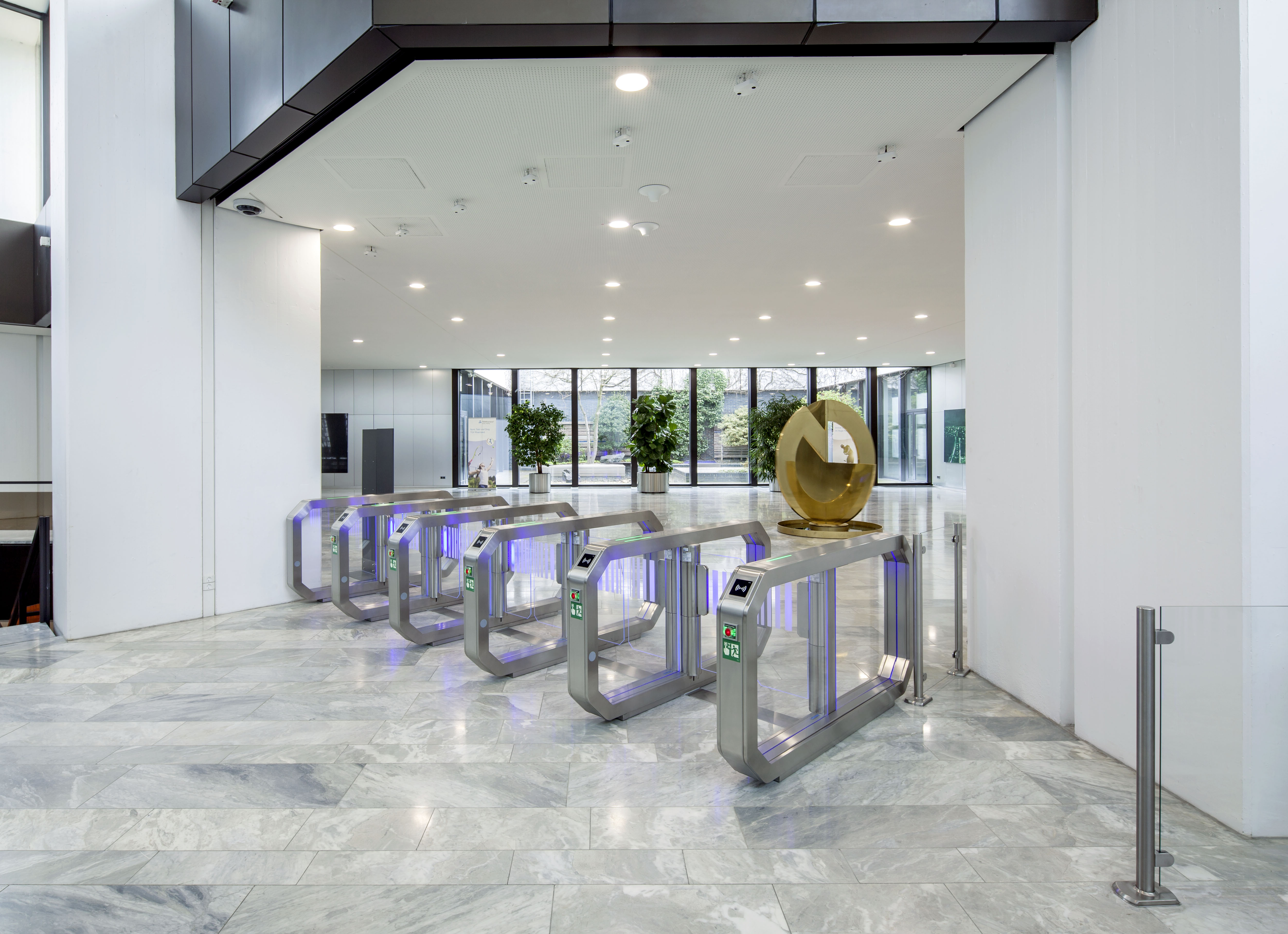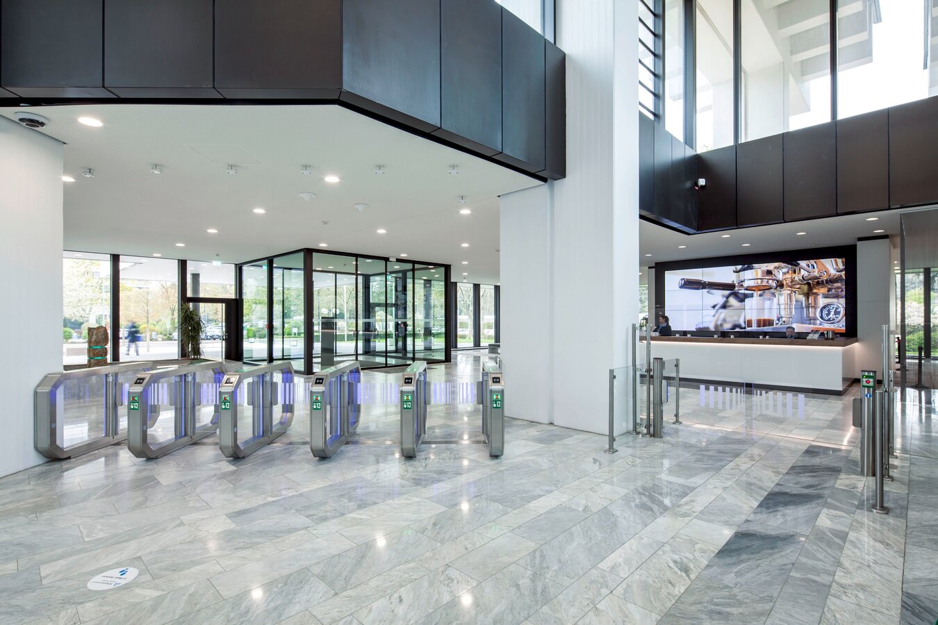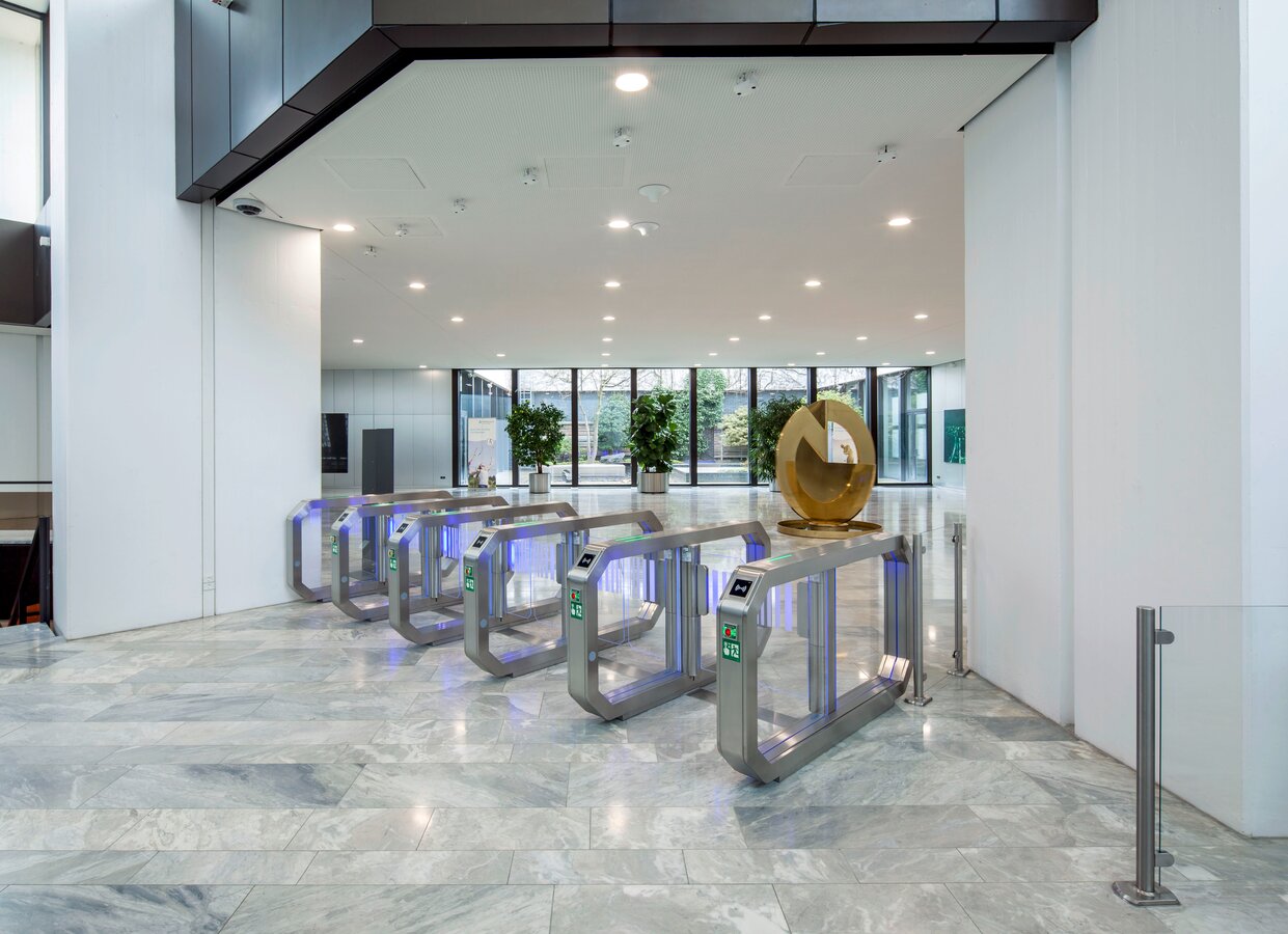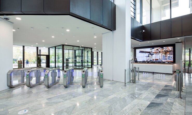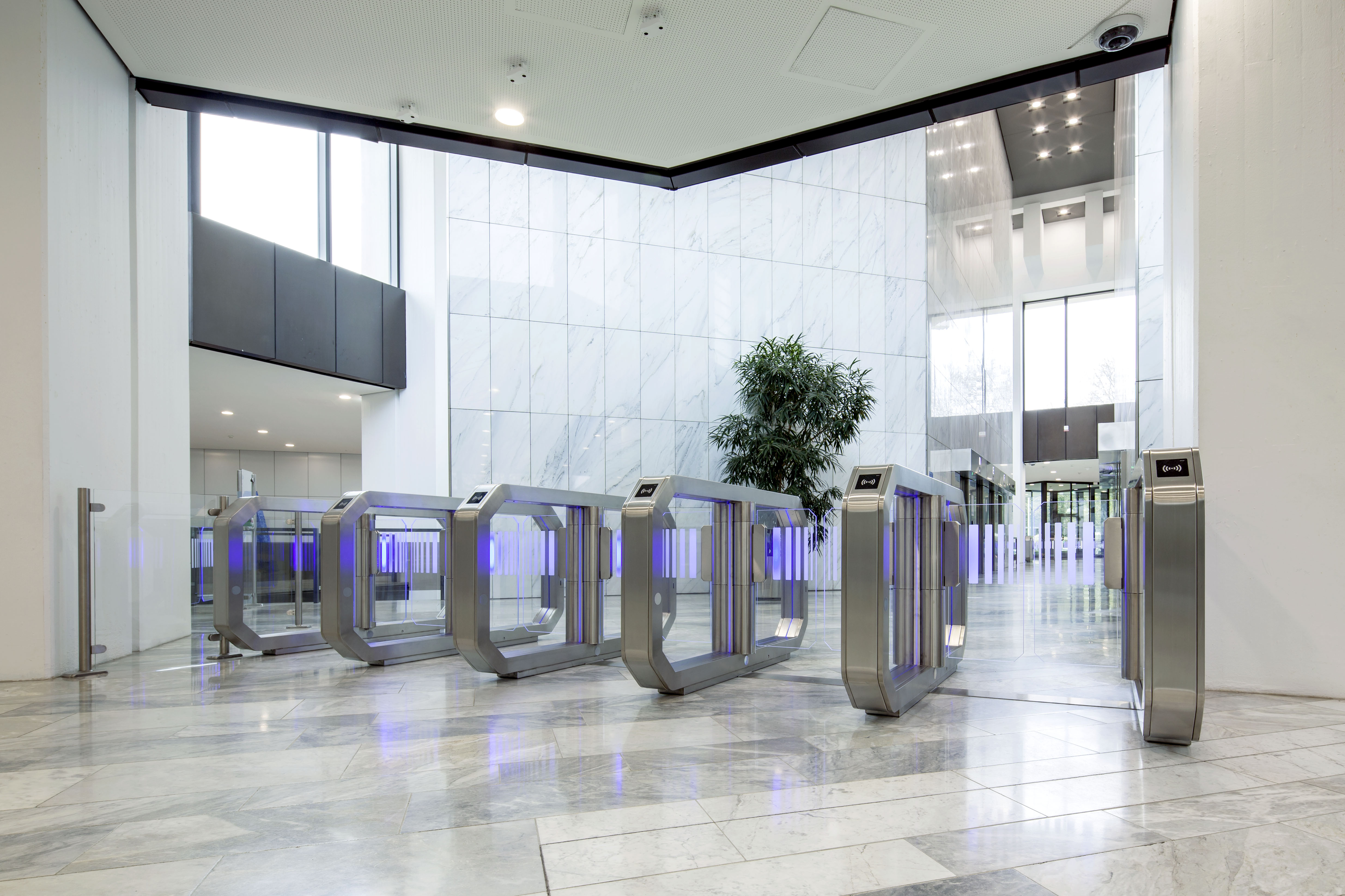 Cinq Galaxy Gates vérifient l’accès au hall de réception de l’immeuble du TÜV Rheinland, dans le quartier Poll de Cologne. « En temps normal, entre 700 et 1 000 personnes entrent chaque jour dans le bâtiment. Nous voulions être bien armés, en particulier pour les heures de pointe. C’est pourquoi nous avons acquis le plus grand nombre possible de portillons », explique Volker Kohn, chef de projet chez TÜV Rheinland Immobilien GmbH. La plupart des personnes qui pénètrent quotidiennement dans le grand immeuble de bureaux sont des employés de l’entreprise. Des scanners RFID assurent en même temps une authentification sûre et facile au niveau de cinq Galaxy Gates. Chaque carte RFID doit être présentée et scannée pour que le passage soit autorisé. En cas de passage individuel, cela permet de faire passer jusqu’à dix personnes par minute par les portillons. Les visiteurs reçoivent une carte d’accès temporaire à l’accueil qu’ils rendent à leur sortie du bâtiment. La programmation effectuée pour la sortie permet une ouverture permanente.