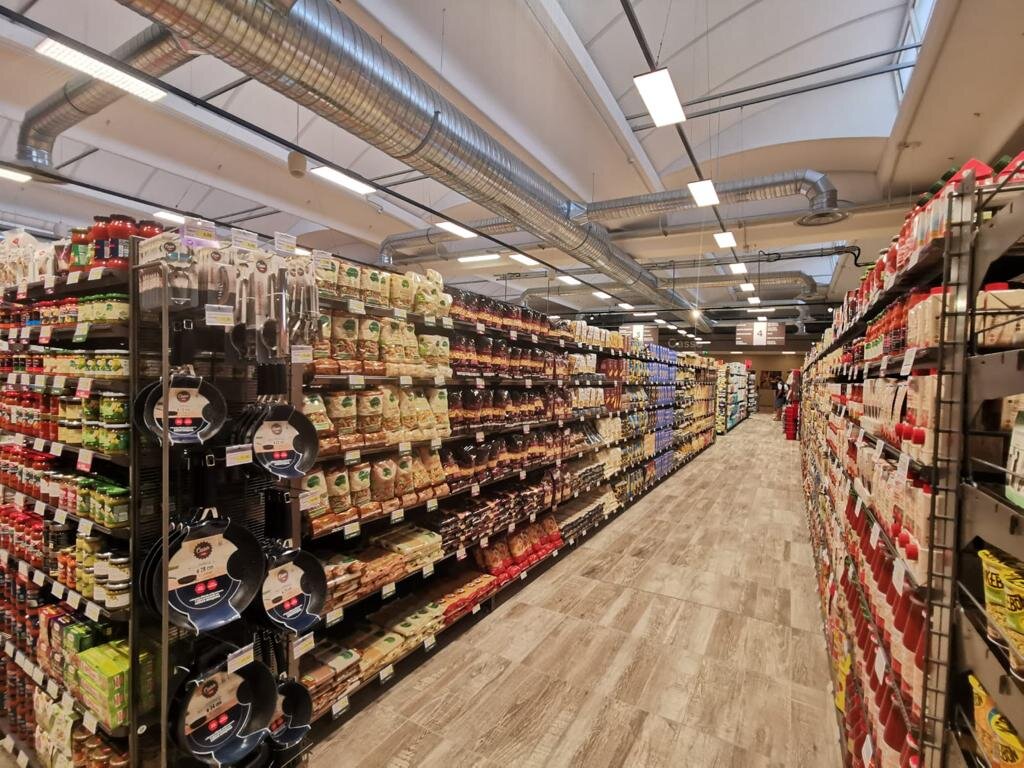 L’arredamento e la scaffalatura del negozio sono innovativi rispetto ai precedenti format adottati: è stata utilizzata la linea di arredo in filo metallico mod. PureTech con finitura industriale, soluzioni personalizzate, carrelli spesa in plastica mod. Salsa 150 color antracite.