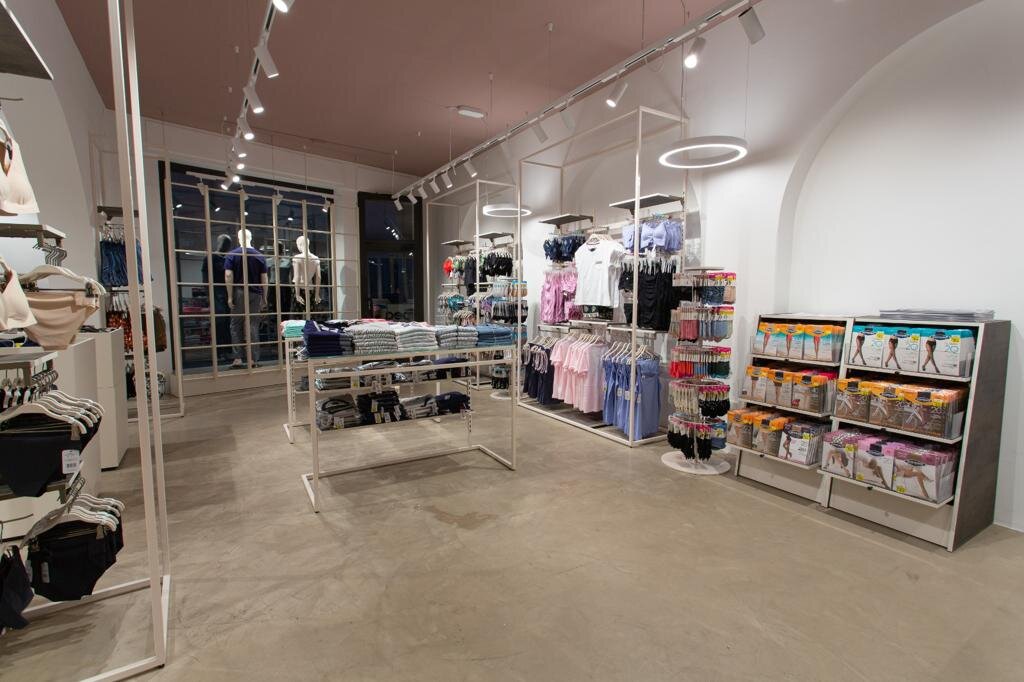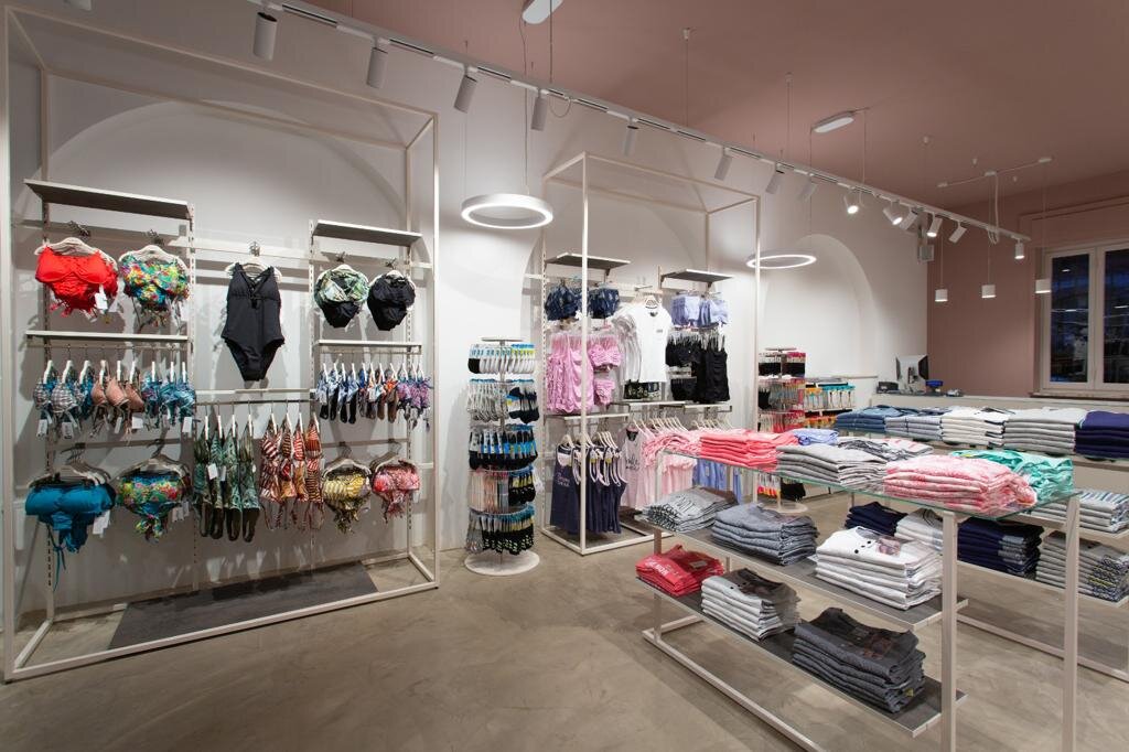 Il design dalle forme essenziali, i colori skin e i materiali utilizzati, valorizzano la “lettura” dei capi esposti e rimandano alla nuova freschezza del brand.