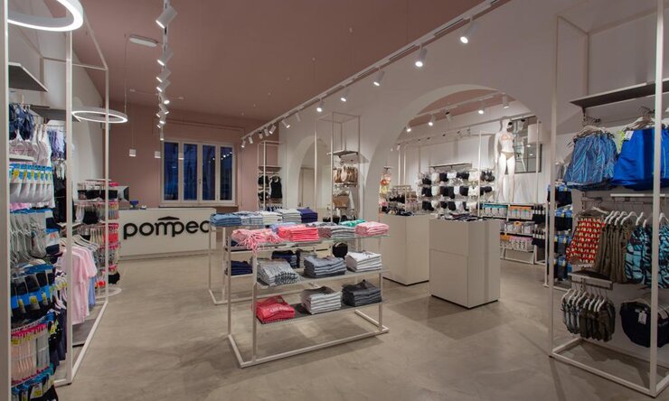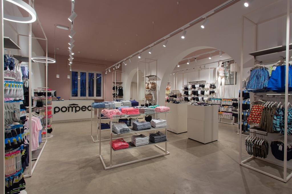 Un punto vendita interamente customizzato, caratterizzato da un layout versatile e modulare, in cui la reinterpretazione di arredi decontestualizzati crea un’identità visiva facilmente riconoscibile, definendo la nuova personalità di Pompea.