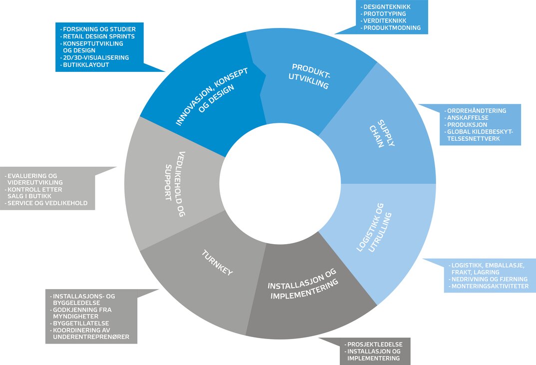 Fra de første konseptuelle tankene, gjennom utvikling, innkjøp, produksjon og montering. Vi håndterer enten alt sammen eller akkurat den delen du trenger hjelp med. Vi har spesialister innen alle områder – zoom inn på dem nedenfor og les mer om hvordan vi kan bidra til prosjektet ditt.