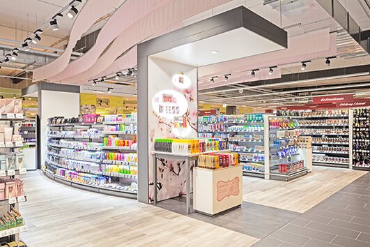 Bølgene i Brenz-elven går igjen som et grafisk tema i hele butikken. Buede gondoler og fargedesign trekker fasadens flytende utseende innover. På den måten oppstår det produktuniverser med en tydelig synlig avgrensning som sikrer god orientering. Treelementer gjør wire tech-hyllene i vin- og kaffeavdelingen mer raffinerte. Den store frukt- og grønnsaksavdelingen med mange regionale produkter er spesielt flott, og den er butikkens første visittkort ved inngangen. Her er bananer, epler, purre og lignende plassert profesjonelt på presentasjonsbordet Vitable. Rett ved siden av er det friskbakte rundstykker hele dagen på salgsmodulen BakeOff 2.0, og deretter kommer man til høydepunktet i REWE CENTER: de kjempestore diskene med fersk fisk, kjøtt, pølse, ost og delikatesser. Konklusjon etter butikkens første driftsår: Kundene har tatt godt imot ferskhetskonseptet og den høykvalitets butikkdesignen.
