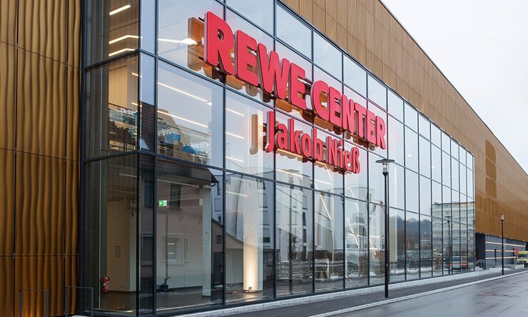 Fasaden, som er kledd med aluminium, er imponerende flott. Den er inspirert av en vannbølge fra den tilstøtende Brenz-elven og gir interessante lysspill avhengig av tidspunktet på dagen. Innvendig fortsetter det like uvanlig: REWE CENTER fremstår som et nytt, selvstendig butikkkonsept med et enormt utvalg på over 45 000 mat- og nonfood-varer fordelt på 3200 kvm uten barrierer. Maten har en autentisk og innbydende sjarm som på et ukentlig ferskvaremarked. Det er takket være møblene som forteller mye om varene de presenterer. Den selvstendige REWE-kjøpmannen Hans-Jakob Nieß driver REWE CENTER, og bestemte seg for å innrede butikken sammen med Wanzl. Bedriften i Leipheim tok seg av den samlede utformingen av butikkdesignen og leverte med wire tech et system for en premiumbutikk med en salgsfremmende varepresentasjon langt over gjennomsnittet.