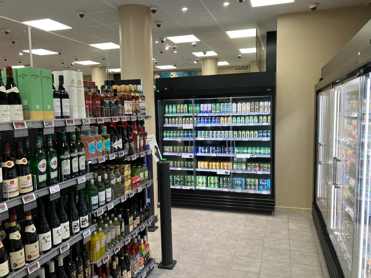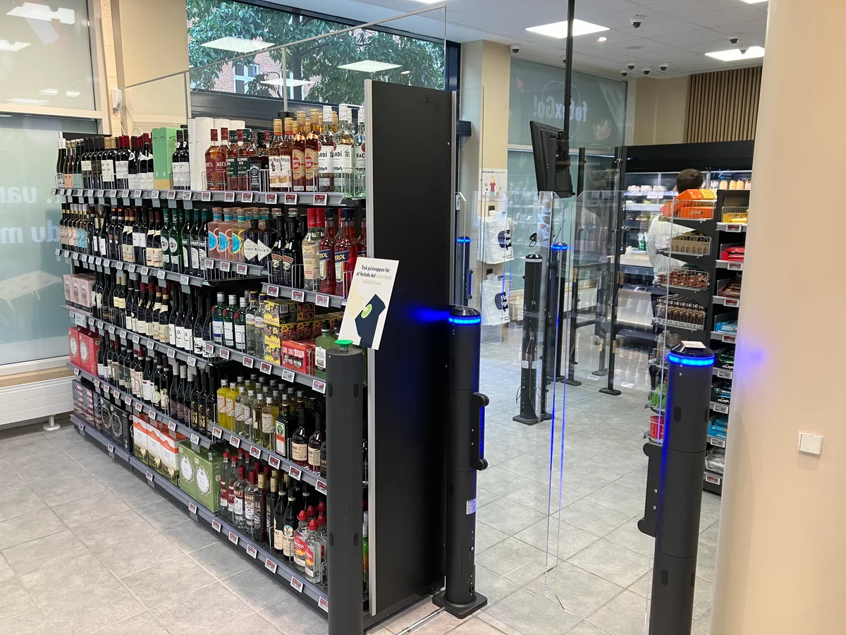 Vi har også levert en kombinert inn- og utgangsløsning til et avgrenset område i butikken, hvor kundene kan kjøpe alkohol – når de har registrert seg med personlig identifikasjon for å bekrefte sin alder. Samtidig har vi levert alt basisinnredning til butikken, slik at den står skarpt til åpningen.