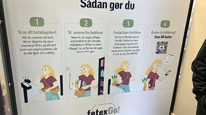 Som kunde kommer du enkelt inn ved å skanne ditt betalingskort. Herfra kan du gå på handletur og handle alt fra ferske retter til enkle måltider, meierivarer, kolonial, snacks og drikkevarer.
