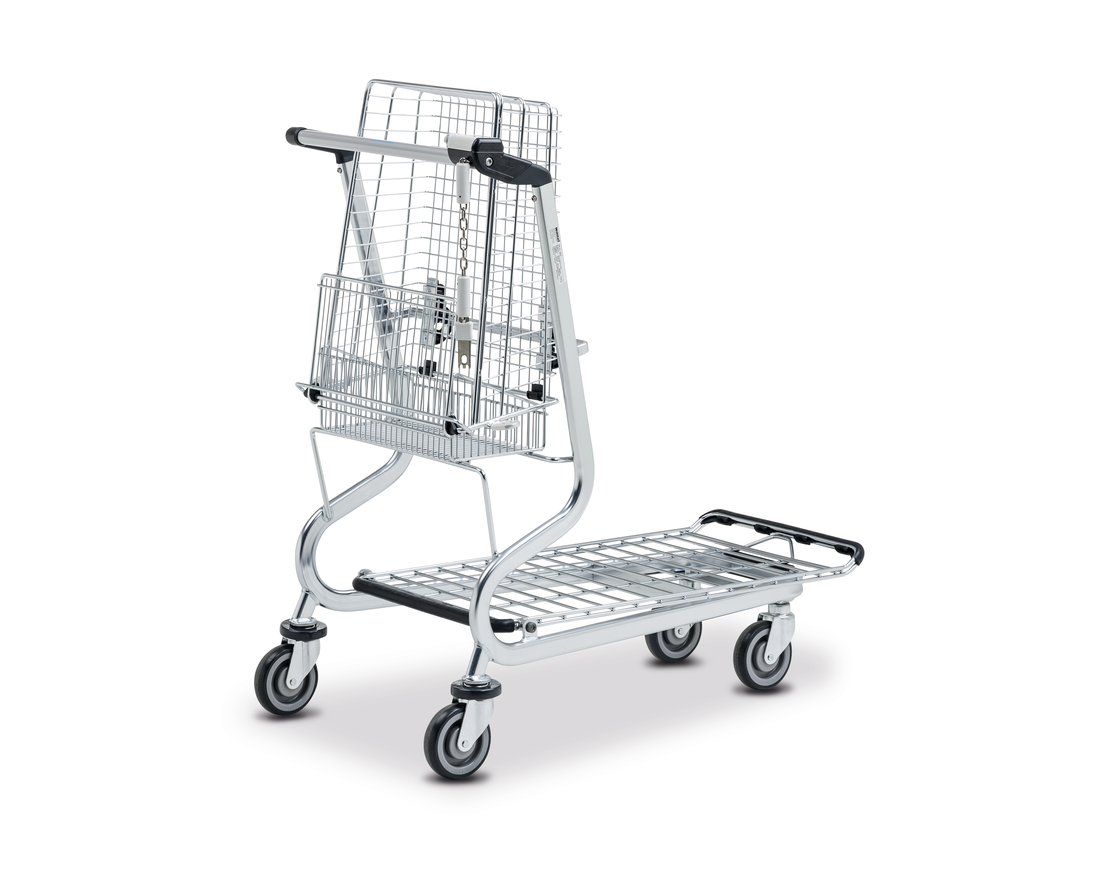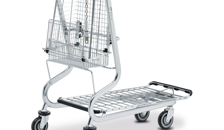 Stevige constructie van plat ovale buis met handgreep van ronde buis en kunststof beschermkappen. Opklapbare warenkorf met kunststof zwenklagers en geluiddempers, fijnmazige korf voor kleine artikelen en antislip draadplatform.