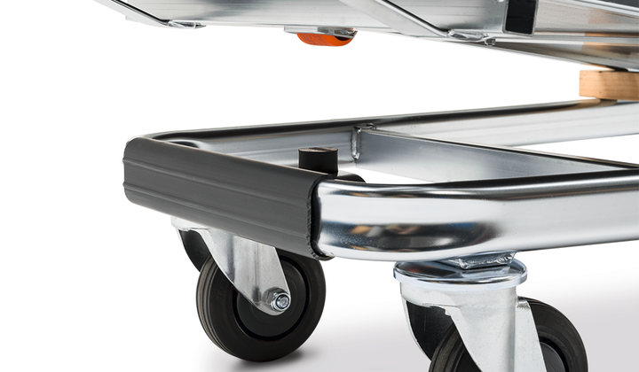 2 vaste wielen voor, 2 zwenkwielen achter, wieldiameter 125 mm, rubber loopvlak.