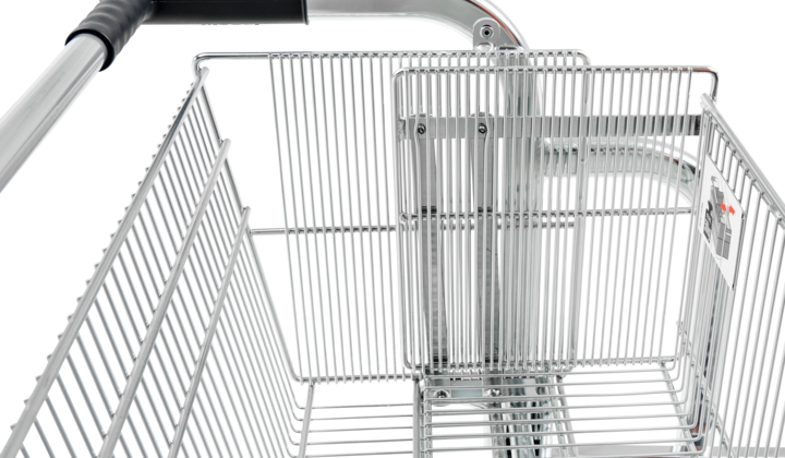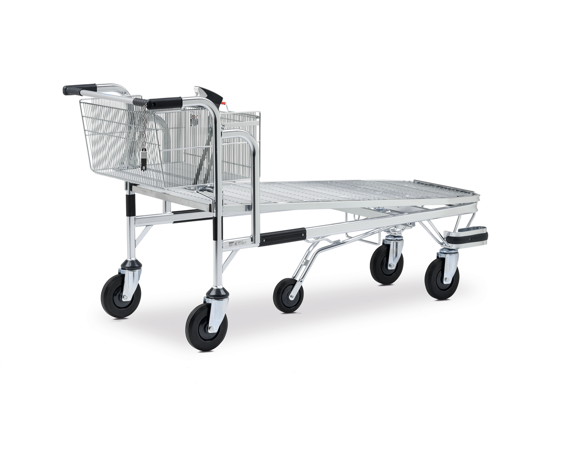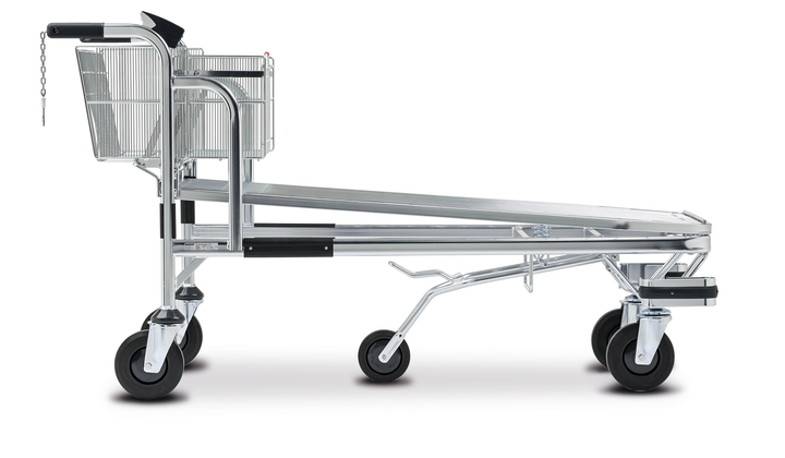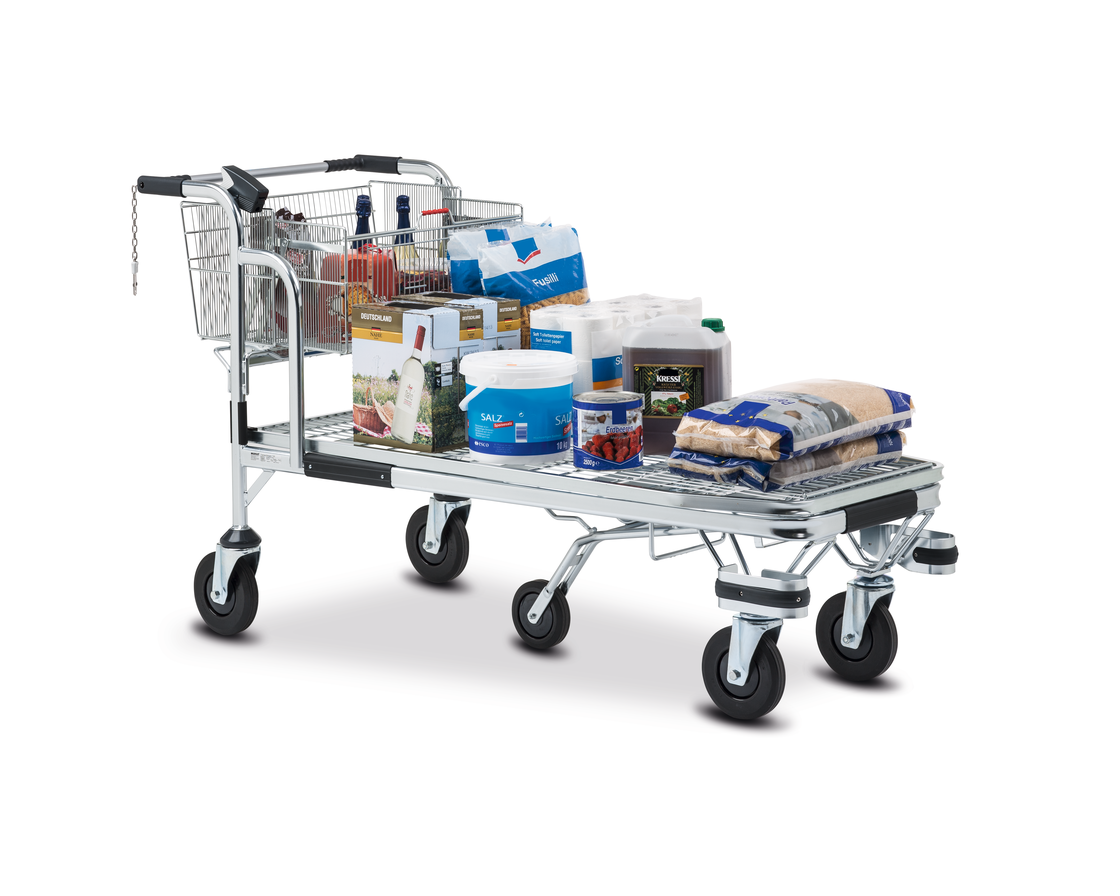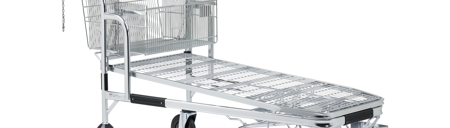 Frame van plat ovale buis met stootbeugels. Handgreepbuis met kunststof houders. Draadplatform, versterkt met op hun kant geplaatste stripijzers en rondom aangebracht beschermframe van profielbuis. Kunststof elementen en profielen voor geluiddemping. Fijnmazige warenkorf, beschermd door frame van plat ovale buis.