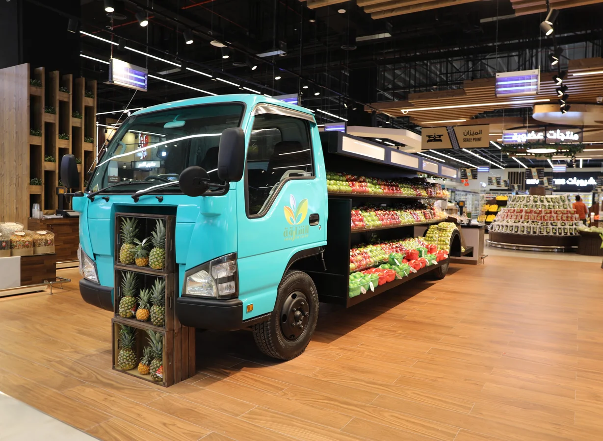 Niebieskie odcienie jako główny motyw wzorniczy prowadzą na stoisko rybne z elementami morskimi, takimi jak kotwica, siatka, koło ratunkowe czy poszycie łodzi, stanowiące tło opisu strefy. Duży wybór świeżych ryb doskonale prezentuje się na lodzie. W ofercie jest też sushi. Kto chce, może również kupić homara bezpośrednio z pojemnika. Naprzeciwko strefy ze świeżymi produktami na okrągłej wyspie umieszczono stoiska gastronomiczne i z grillowanymi produktami wyposażone w stołki, na których można na chwilę spocząć. Na półokrągłym stoisku oferowana jest pizza, makarony, sałatki i lokalna kuchnia arabska, np. szoarma. Produkty można spożyć na miejscu lub zabrać na wynos. Na gości czekają też świeżo przyrządzone specjały z ryb, drobiu i wołowiny. W dziale warzyw natychmiast przyciąga wzrok klientów niebieska ciężarówka i mniejsze, brązowe wózki, wypełnione owocami i warzywami. Klienci czują się tu jak na miejskim rynku, na którym codziennie oferowane są najsmaczniejsze świeże produkty. Obok czeka na klientów piekarnia z cukiernią ze świeżymi naleśnikami, wafelkami we francuskim stylu i słodkimi arabskimi przysmakami, takimi jak bakława.