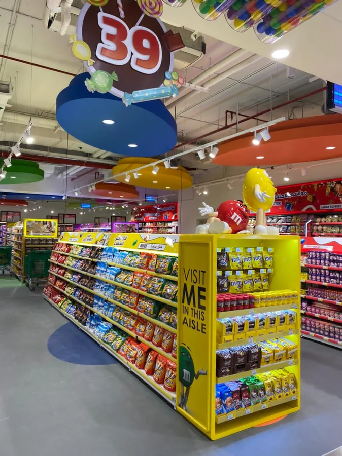 Atrakcją hipermarketu jest również ekspozycja oliwek, warzyw w słoikach oraz oliwy z oliwek na okrągłym meblu prezentacyjnym w postaci dużego talerza obrotowego na przyprawy. Ze środka wyrasta drzewo oliwkowe. Hołd dla regionalnych zwyczajów: Przed jedzeniem lub na specjalne okazje gospodarze chętnie oferują specjały z oliwkami i warzywami w słoiku. W dziale słodyczy robi się bardzo kolorowo. Wyraźnie widać regały i panele sufitowe w jaskrawych kolorach oraz symbole cukierków: To istny raj dla łasuchów. Prawdziwym magnesem jest również dział zabawek dla dzieci. Kolorowe pociągi, a nawet słynny londyński autobus piętrowy, prezentują zabawki, książki i wiele innych artykułów. Zwłaszcza dzieci zanurzają się tu w fascynującym świecie pełnym radości i zabawy.
