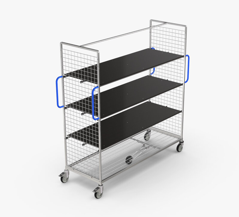 I nästa steg utrustar användaren vagnen med våningsplan. För statiska element erbjuder produktsortimentet anslutningsrör eller gallerhyllplan som skruvas i mellan de båda sidodelarna i den övre änden. Andra möjligheter är våningsplan för iskruvning eller en bakre vägg med galler som dessutom förhindrar att godset glider igenom. Om vagnen belastas med mer än 50 kg krävs minst ett statiskt element för stabilitetens skull. För mer förvaringsutrymme kan ytterligare hyllplan läggas till. Här väljer användaren mellan fyra olika alternativ som skiljer sig åt när det gäller upphöjning (25 mm eller 100 mm) och material (trådgaller eller trä). När plockvagnens grundstomme har skapats fortsätter man med tillbehören. Handtagsbygel gör det lättare att styra vagnen. Handtagen är tillverkade av stålrör och är täckta med plast. De kommer i ultramarinblått och eldrött. Om vagnen ska kunna vridas 360 grader på stället bör man lägga till ett femte styrhjul. En praktisk skrivskiva som hängs på utsidan av gaveln bidrar till ett strukturerat arbetssätt. Den har en klämlist och dess lutningsvinkel är justerbar. För att transportera värdefulla produkter på vagnen på ett säkert sätt kan man i kombination med en gallerbakvägg även lägga till låsbara dörrar.
