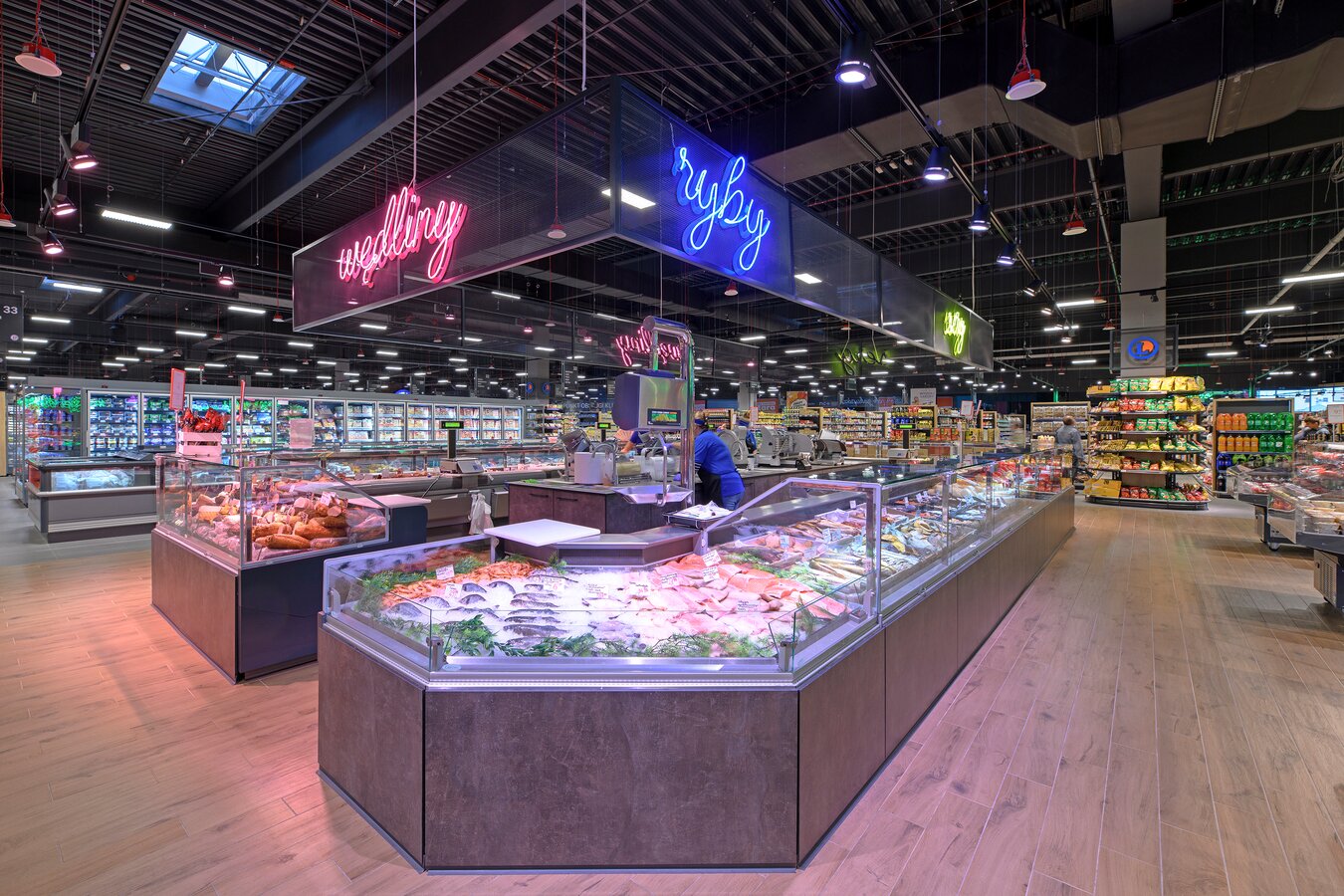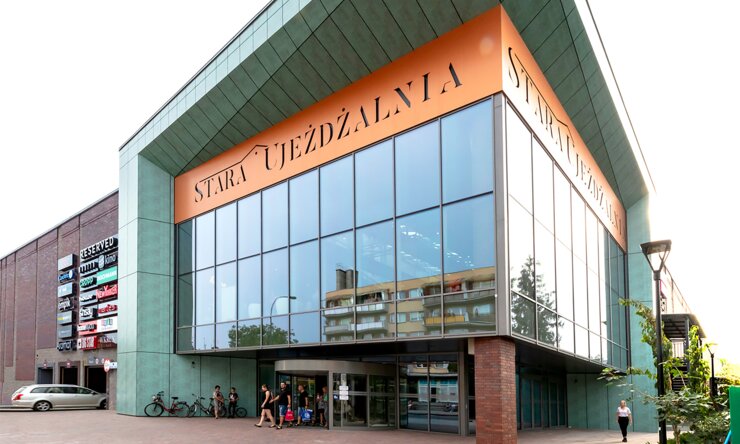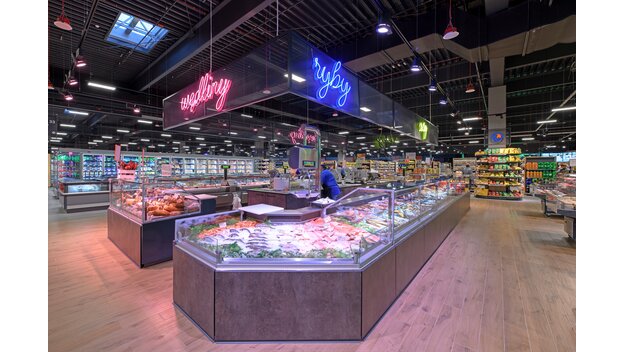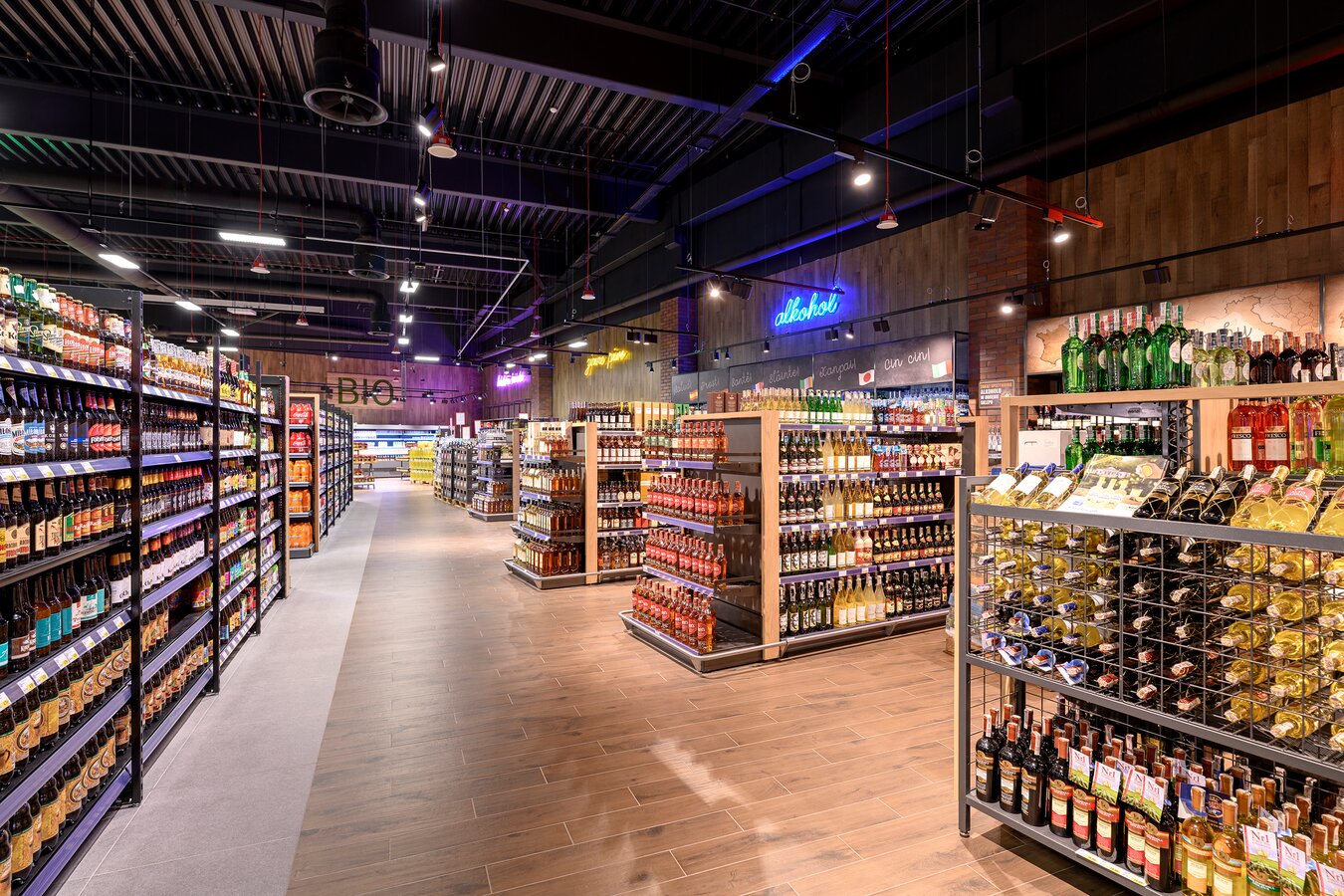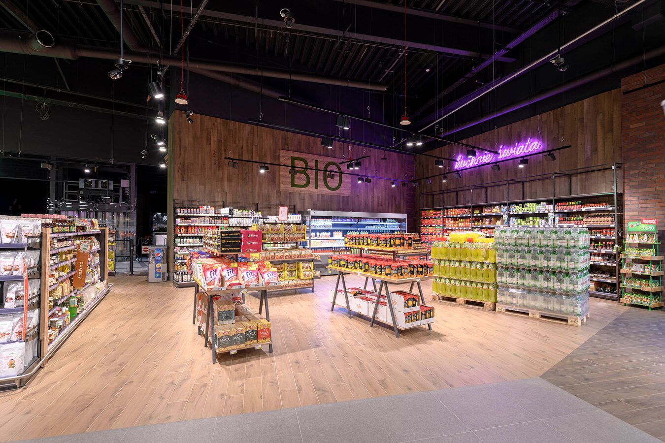 Det tog ägaren ett år att hitta den perfekta designen till sin första stormarknad. Den ligger i butikscentret med det klingande namnet ”Stara Ujeżdżalnia” (”Gamla ridskolan” på svenska) vilket anspelar på den tidigare användningen av området. Redan utvändigt bryter komplexet som byggdes mellan 2017 och 2018 mot Krakows jugendstil. De dominerande materialen är röd klinkers, naturbetong, stål samt en imponerande glasfasad vid entrén.