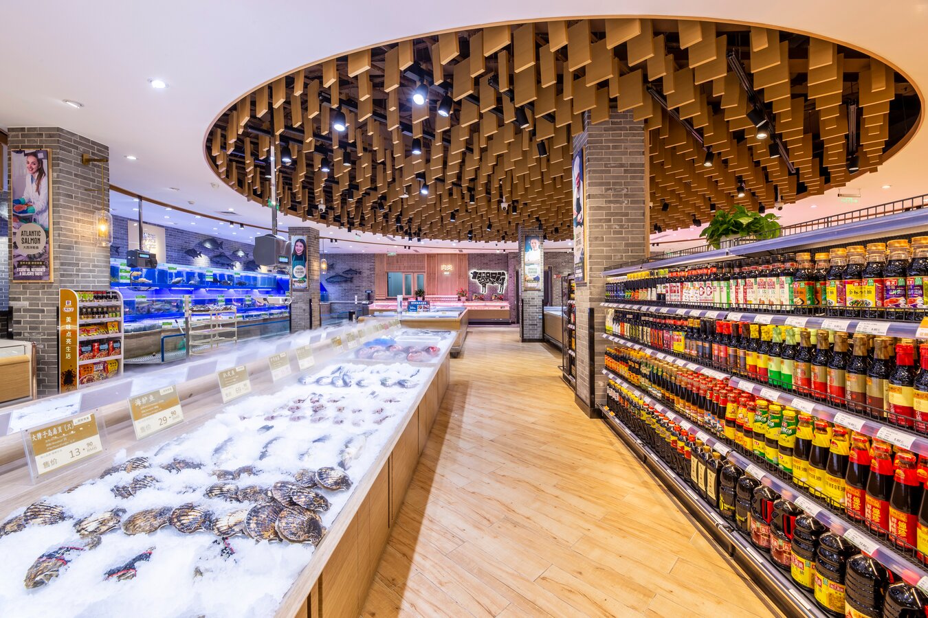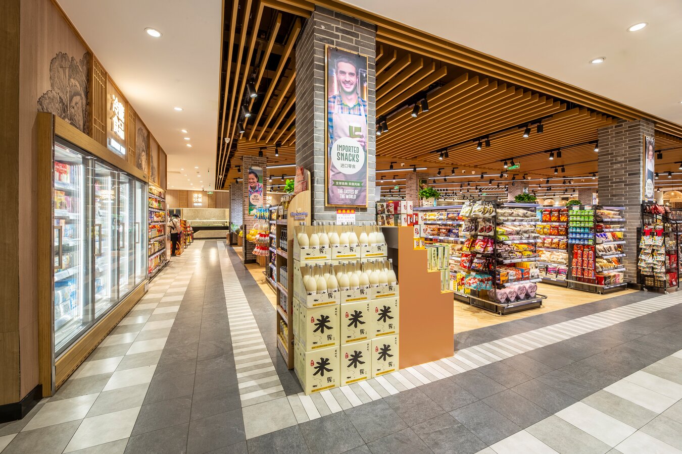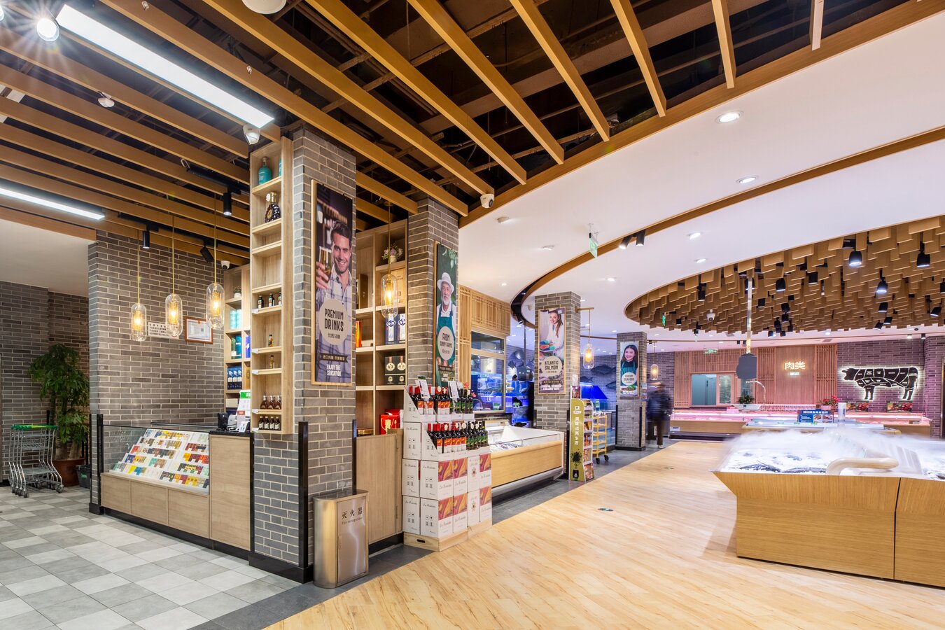 店内大面积的木纹装饰与带人物海报的结合向消费者传递农作精神,尊崇自然生长的有机产品,为顾客营造出丰收市集的景象。