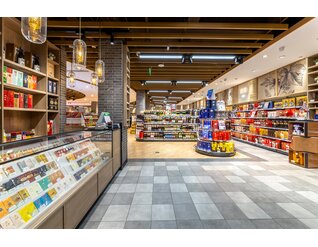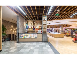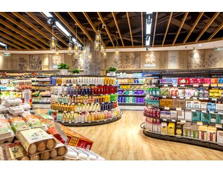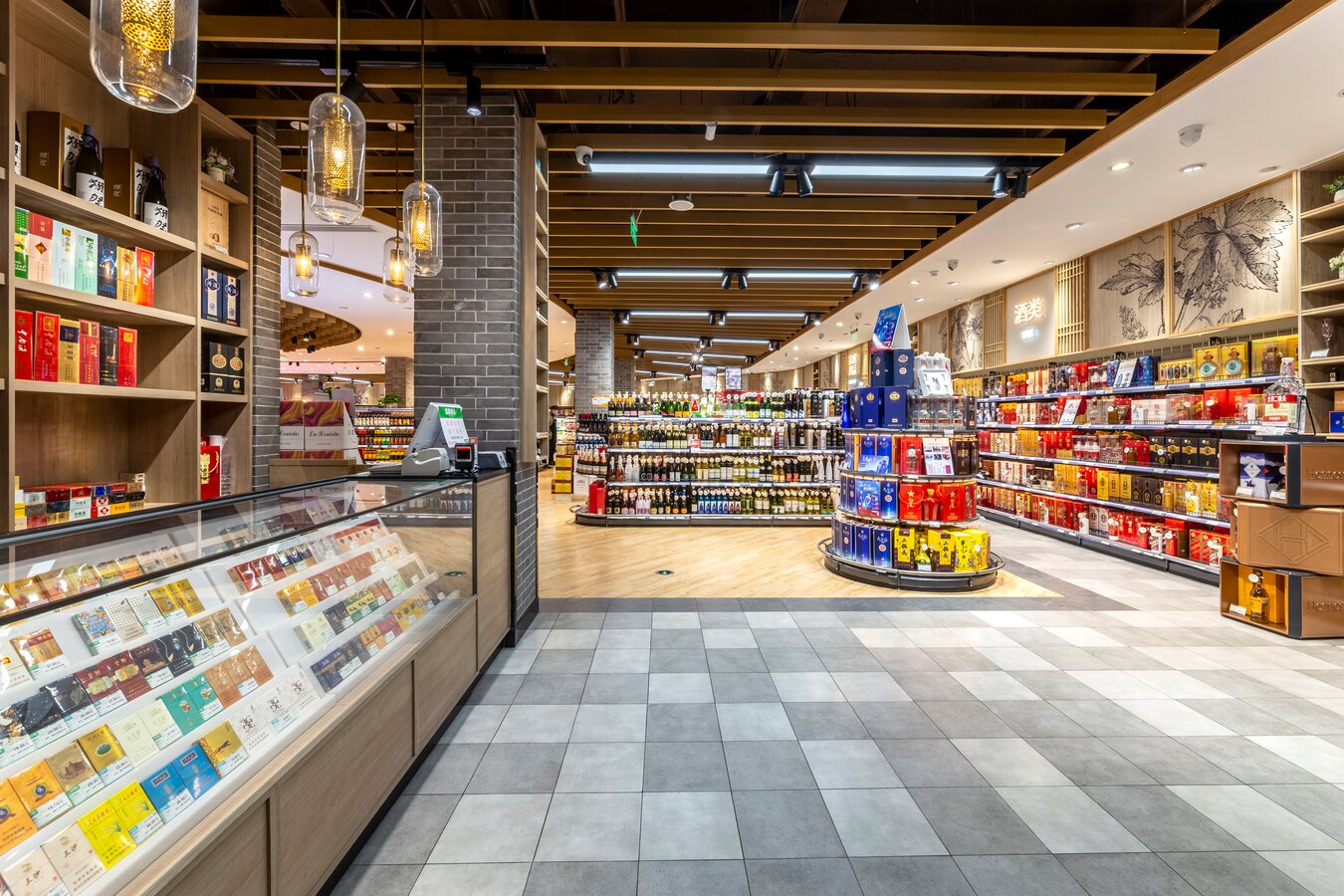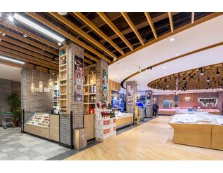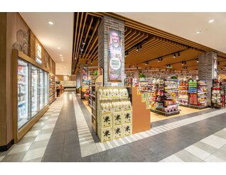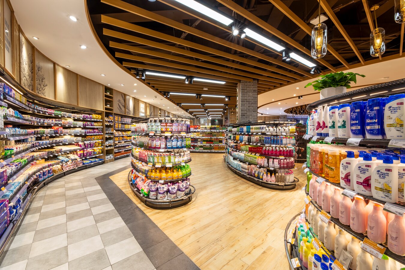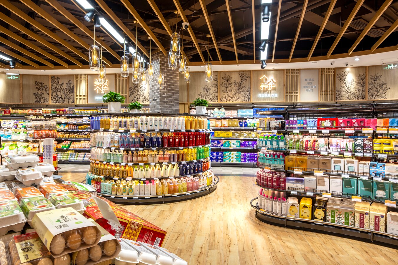 店内大面积的木纹装饰与带人物海报的结合向消费者传递农作精神,尊崇自然生长的有机产品,为顾客营造出丰收市集的景象。