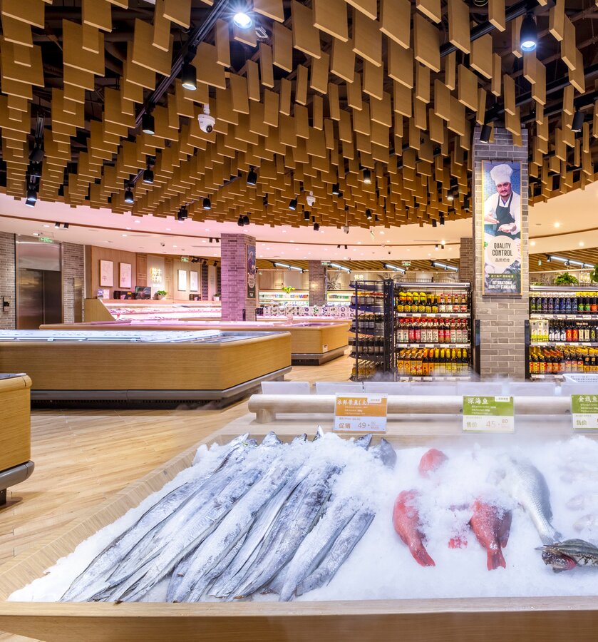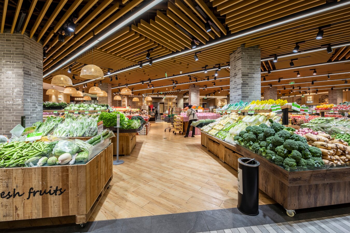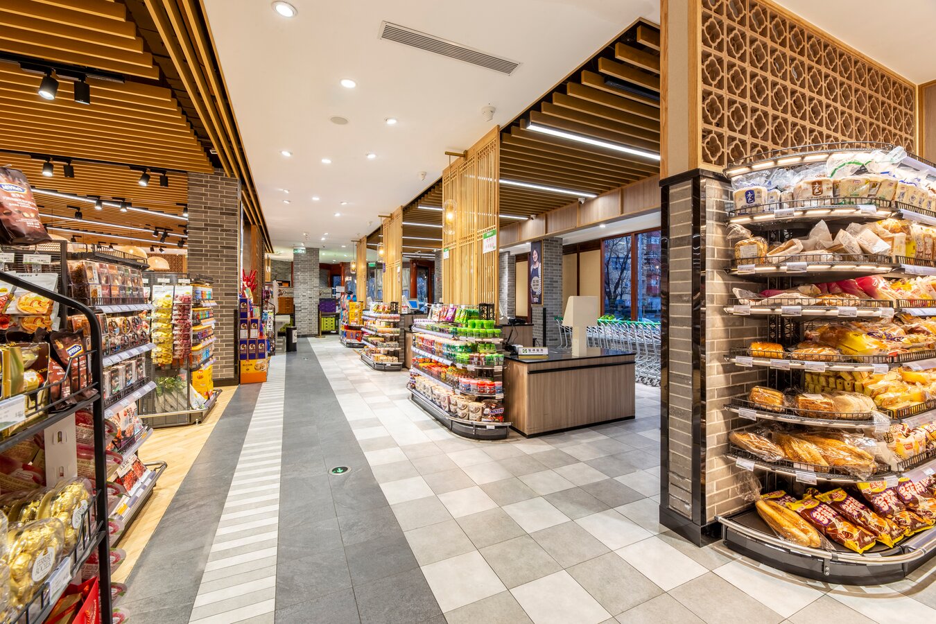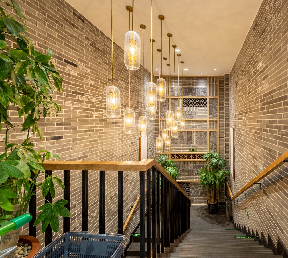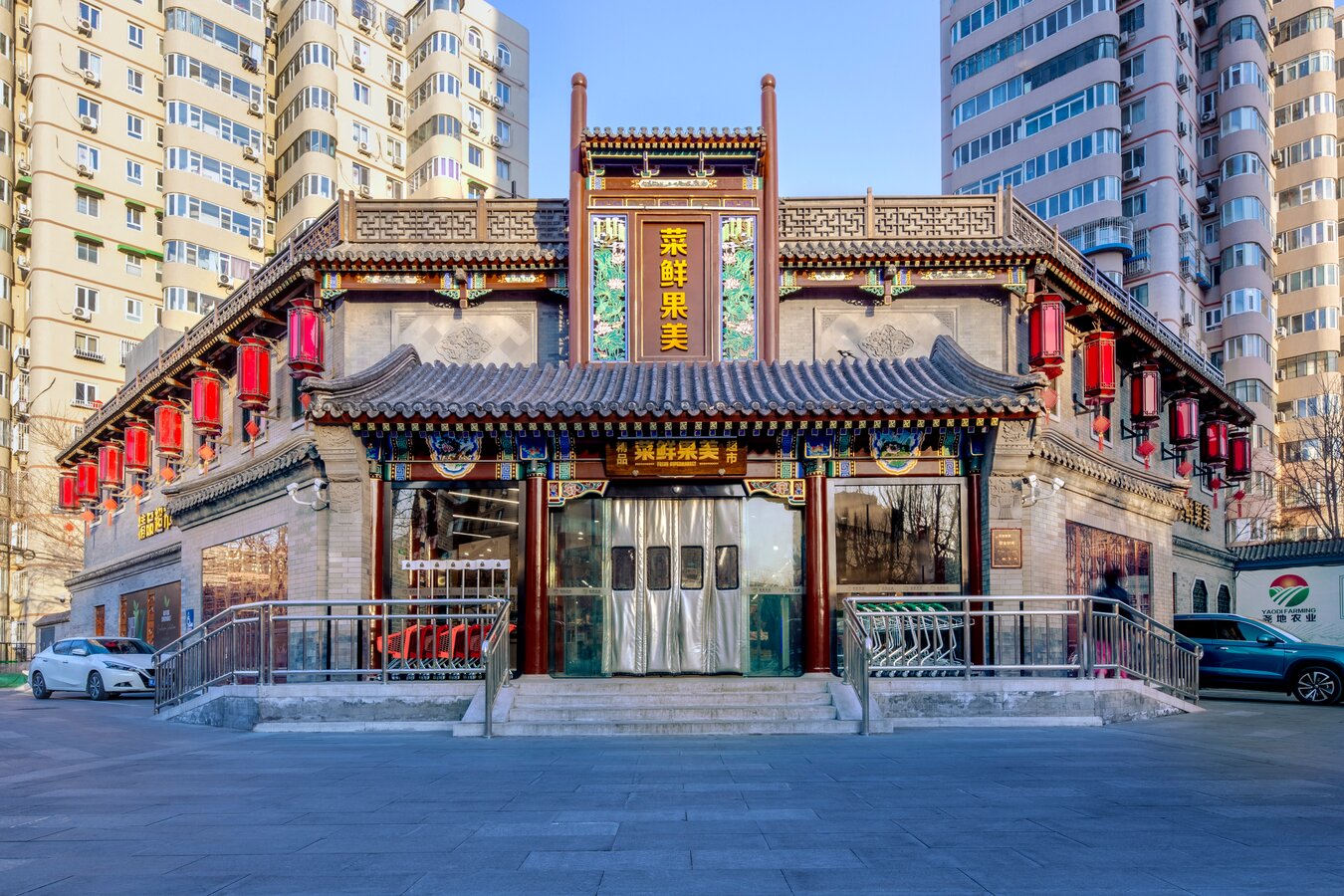 此超市是一个街边独立店,建筑外观是传统中式风格。考虑到周边以居民为主,老北京风格的也颇受当地人及游客的喜爱,在设计全新菜鲜果美形象店时将原建筑元素尽可能的保留,对部分外立面做了修复与装饰,既吸引顾客,又能与周围环境很好的融合。