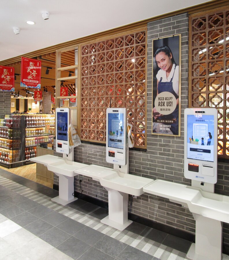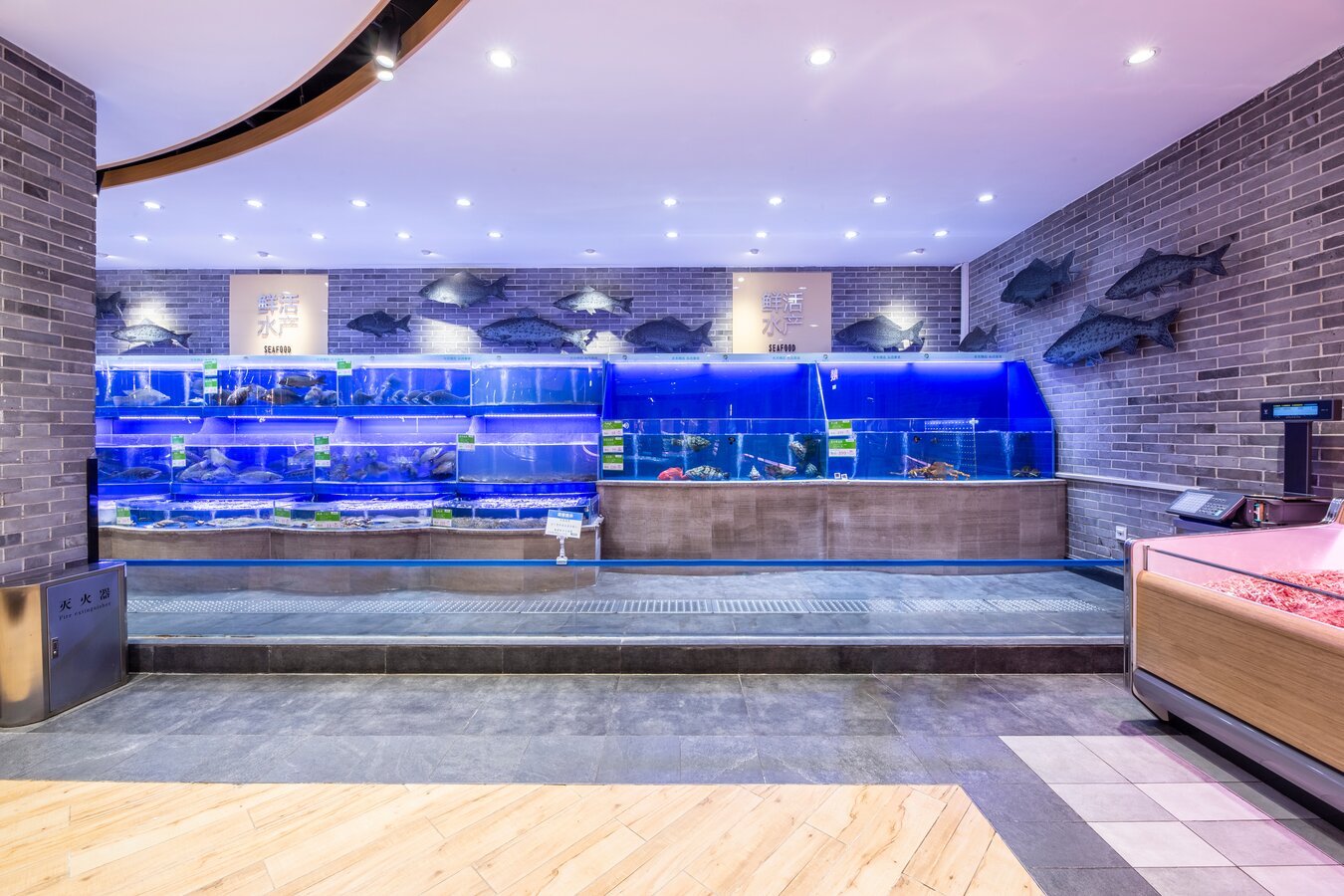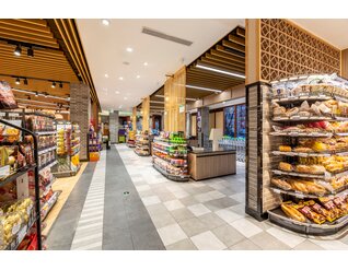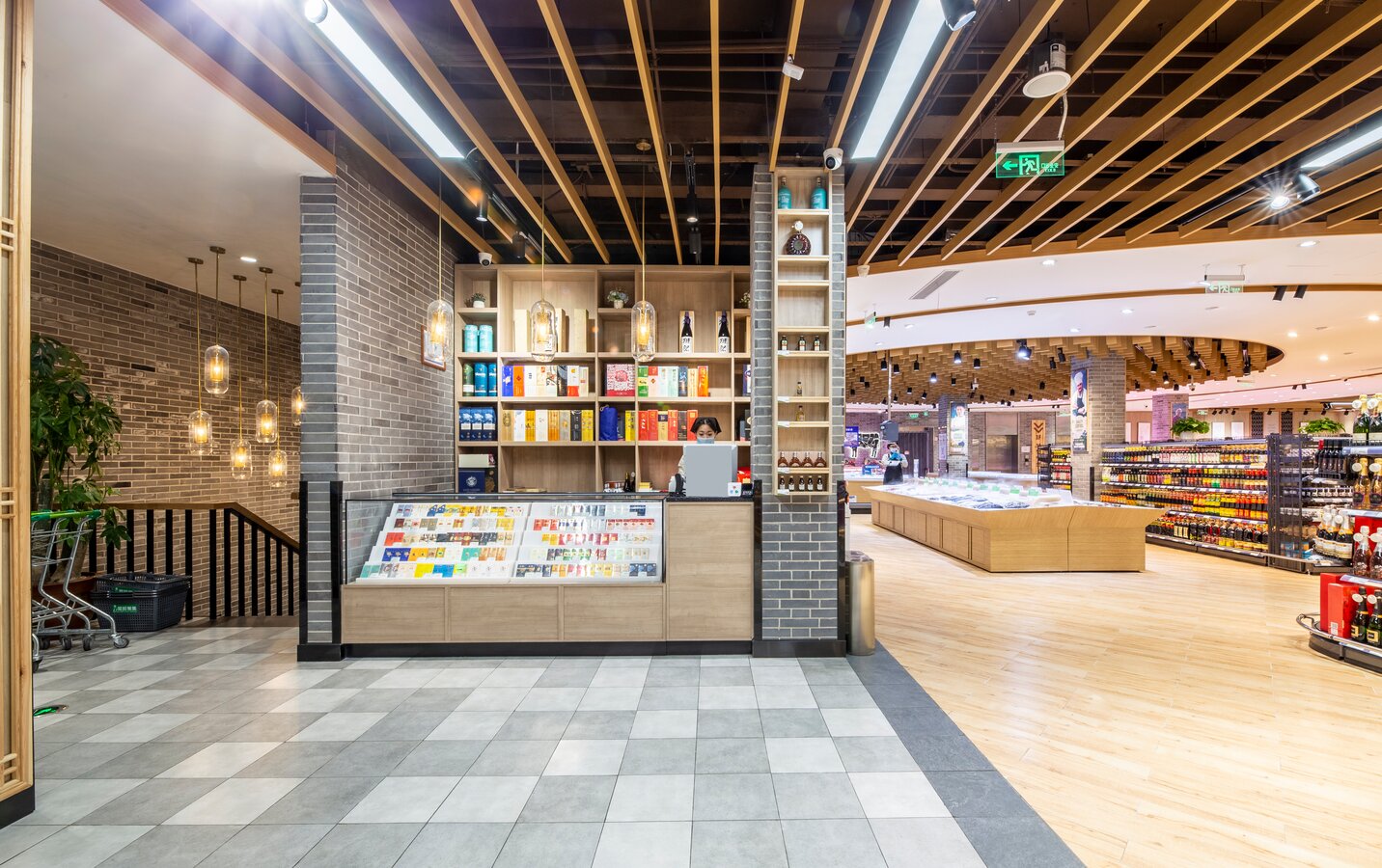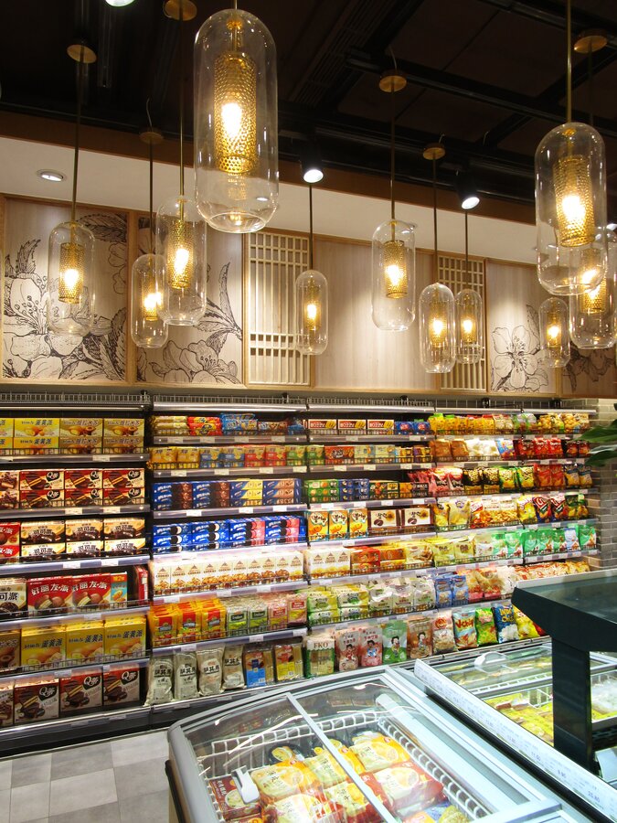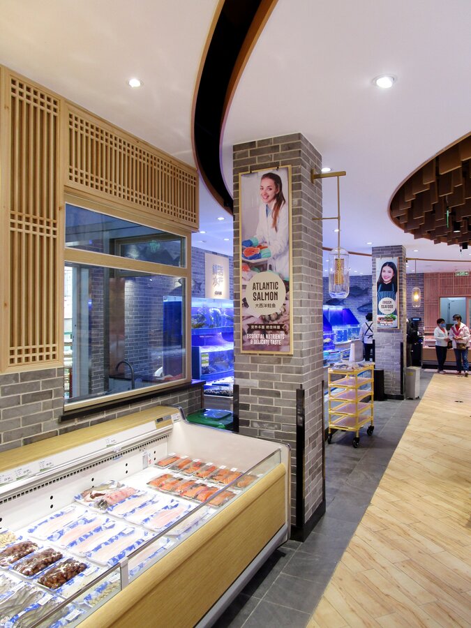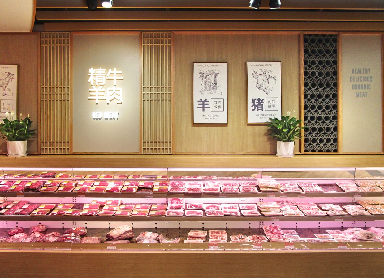 此超市是一个街边独立店,建筑外观是传统中式风格。考虑到周边以居民为主,老北京风格的也颇受当地人及游客的喜爱,在设计全新菜鲜果美形象店时将原建筑元素尽可能的保留,对部分外立面做了修复与装饰,既吸引顾客,又能与周围环境很好的融合。