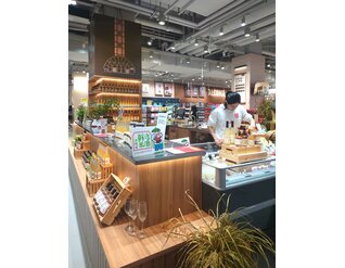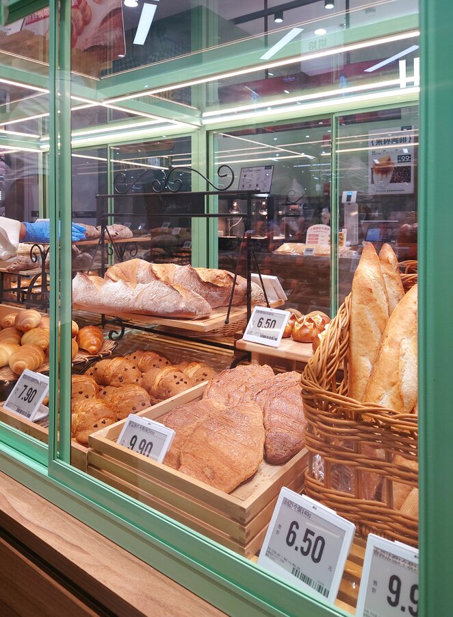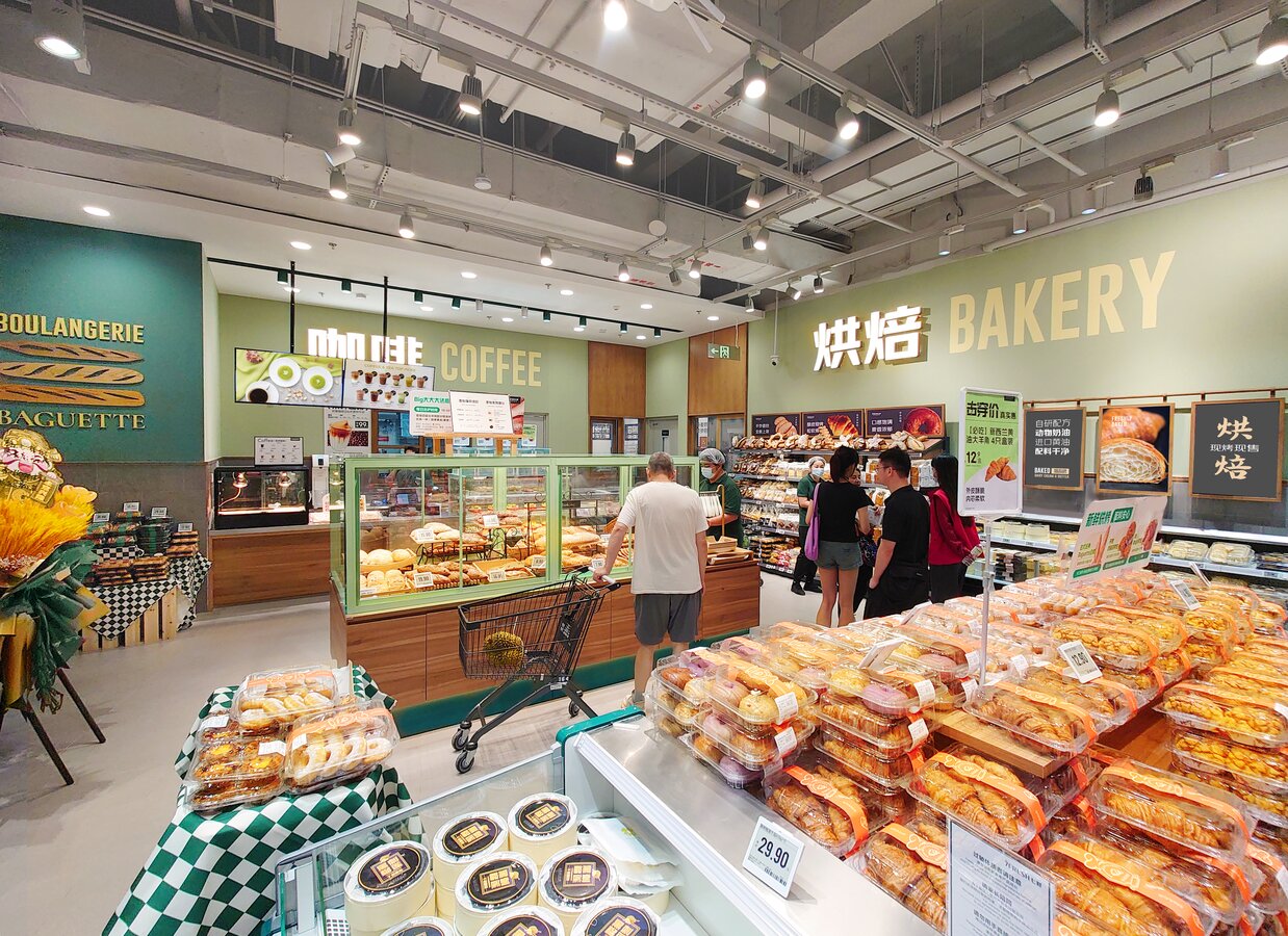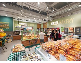 靠近入口处的面包房提供新鲜面包、现代甜点和咖啡吧,所有这些都包裹在清新、现代的绿色调中,更加强化了品牌的形象。
