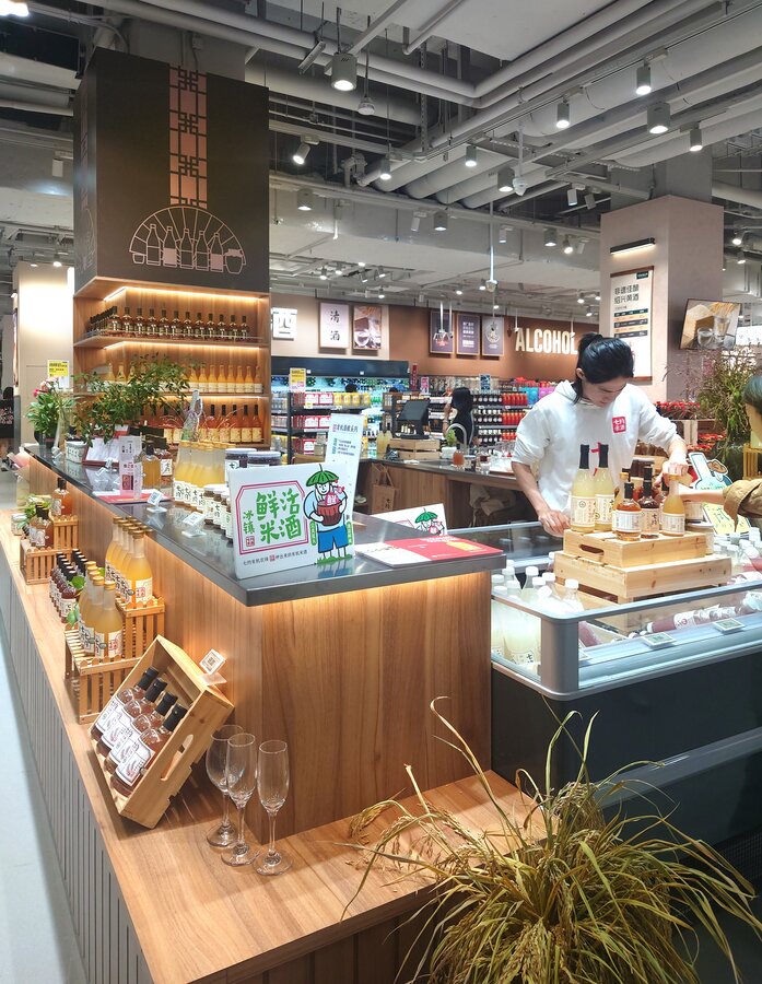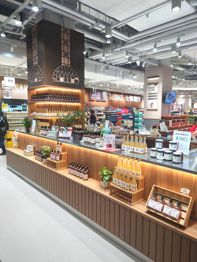 店内的用餐区设有装饰性窗户、木质元素和绿色点缀,营造出自然、健康的氛围。米酒柜台和海鲜区设有生蚝吧和活海鲜,配以主题装饰,提供独特的体验。商店还展示了各种京东七鲜自有品牌商品,再展现高品质的商品的同时,价格也更加亲民。