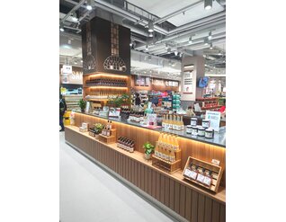 这个超市采用开放的浅灰色天花板和混凝土地面,突显出石榴红、海军蓝、褐灰色和巧克力色的精致配色方案。 超市布局以市场风格的水果和蔬菜展示开始,设有一个宽敞的水果柜台。